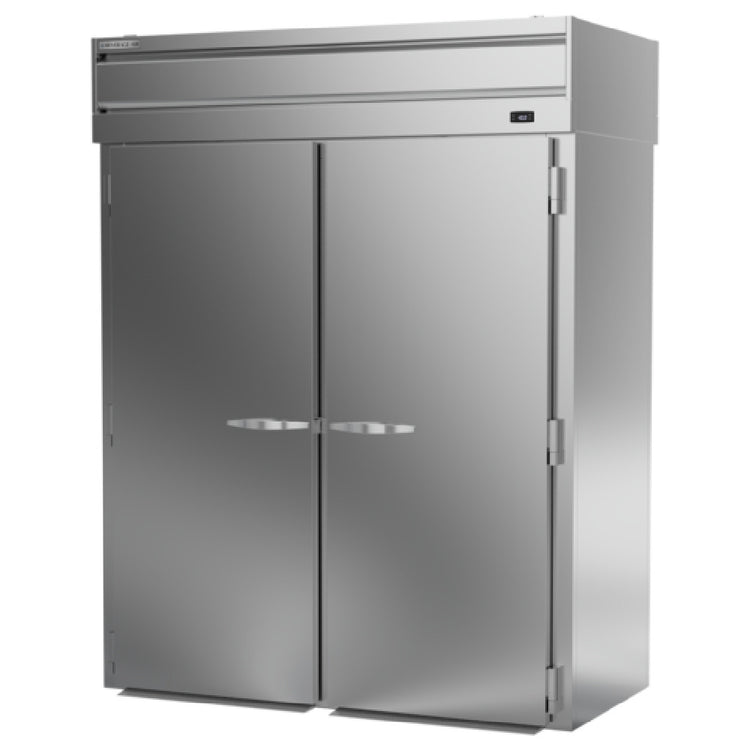 The Beverage Air PFT2XTHC-1AS P-Series Freezer Extra Tall Roll-Thru is a two-section, top mount self-contained refrigeration unit that caters to various industry segments requiring large capacity and efficient cold storage. With an impressive 85.8 cu. ft. capacity, this freezer is designed for high-volume storage needs. Its stainless steel exterior and interior ensure durability and easy maintenance, while the standard depth cabinet offers ample space for organized storage. Featuring (4) locking full height 22 gauge stainless steel doors, this freezer provides secure access to contents, making it ideal for environments where security and accessibility are paramount. The electronic temperature control and indicator allow for precise monitoring, ensuring optimal storage conditions for your products. Enhanced with LED lighting, visibility within the unit is maximized, facilitating quick and efficient access. The inclusion of a stainless steel ramp supports easy roll-thru capabilities, making it particularly suitable for busy commercial kitchens or institutional settings. The unit is powered by (2) 3/4 HP compressors and is cULus, UL EPH Classified, and UL-Sanitation certified, underscoring its compliance with rigorous safety and sanitation standards. Proudly made in the USA, the Beverage Air PFT2XTHC-1AS P-Series Freezer embodies reliability and excellence for professional culinary environments.