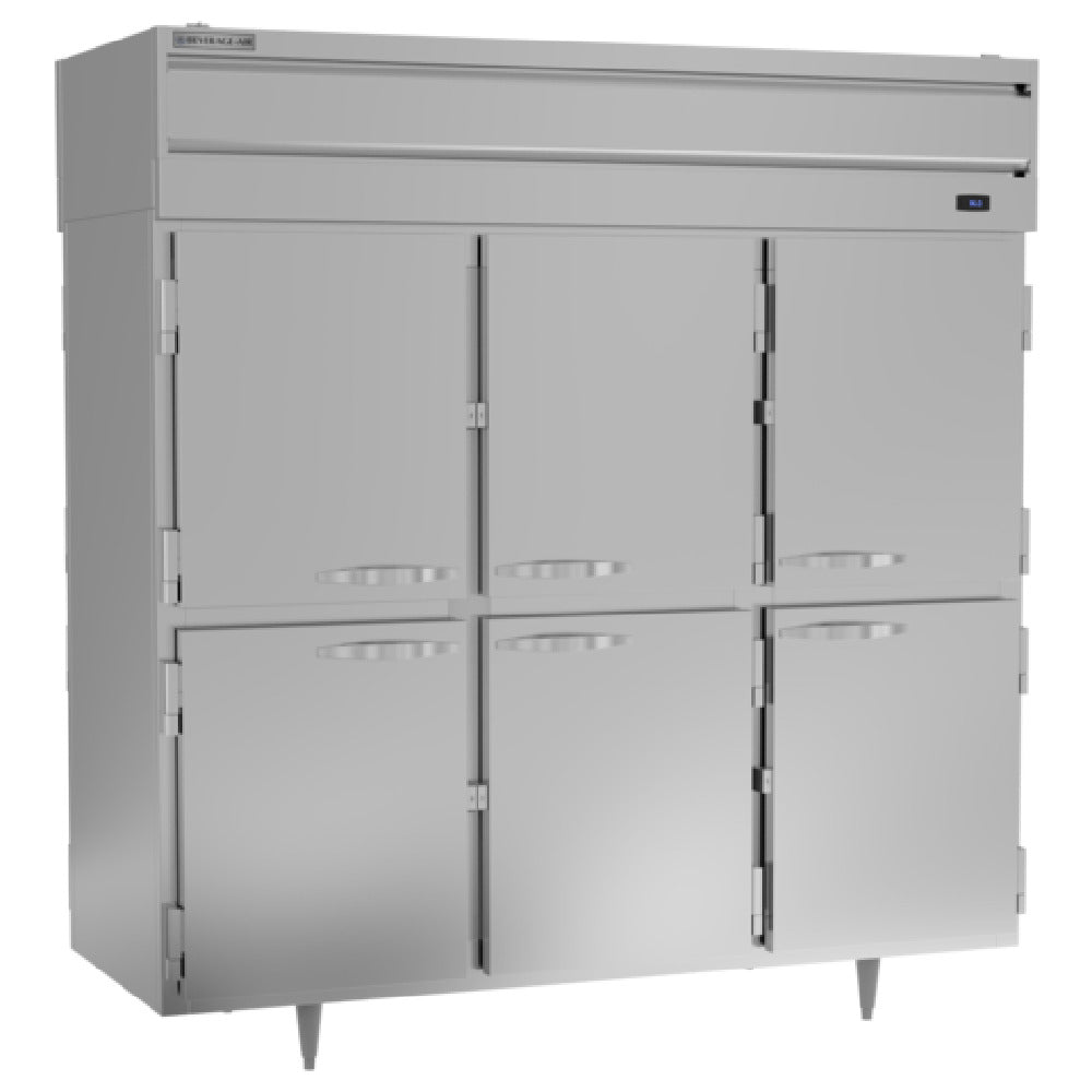 The Beverage Air PRD3HC-1AHS P-Series Refrigerator Pass-Thru Three-section is engineered for high-capacity and efficient storage solutions in commercial environments. With a substantial volume of 73.99 cubic feet, this refrigerator is adept at managing extensive inventory while maintaining optimal temperatures. It features a top-mounted self-contained refrigeration system powered by a 3/4 HP motor, ensuring consistent cooling performance. The unit includes twelve solid half doors and nine adjustable shelves, allowing for customizable storage configurations tailored to various needs. The aluminum interior provides a lightweight yet durable storage environment, while the stainless steel exterior offers resilience and an easy-to-clean surface. Enhanced visibility and convenience are achieved with integrated LED lighting and an exterior digital thermometer, providing precise temperature monitoring. The refrigerator is equipped with 6-inch legs for elevated stability and accessibility. Recognized with cULus, UL EPH Classified, and UL-Sanitation certifications, the unit adheres to stringent safety and sanitation standards, making it suitable for diverse market segments, including restaurants, catering services, and institutional facilities. Proudly made in the USA, the Beverage Air PRD3HC-1AHS P-Series Refrigerator is a reliable refrigeration solution that combines robust features with compliance to high industry standards.