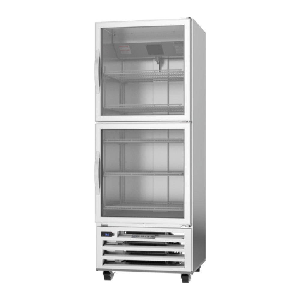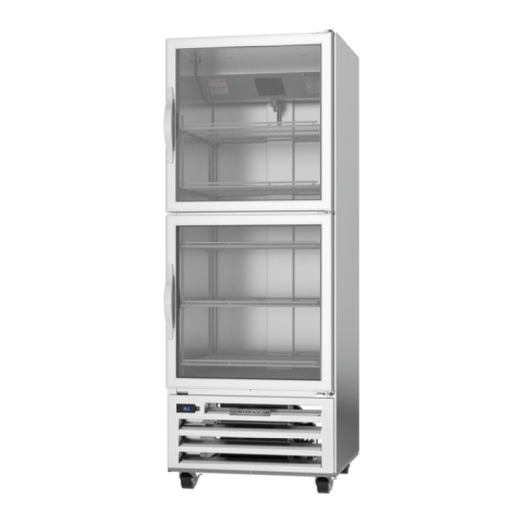The Beverage Air RI18HC-HG Reach-in Refrigerator is a high-performance refrigeration unit designed for commercial use, boasting a capacity of 16.85 cubic feet. This one-section refrigerator features two half glass hinged doors, contributing to easy access and visibility, making it ideal for various food service environments. It comes equipped with five adjustable shelves, allowing for customizable storage solutions to accommodate diverse inventory sizes. The interior of the unit is illuminated with energy-efficient LED lighting, ensuring clear visibility of stored items. A bottom-mounted self-contained refrigeration system enhances efficiency and ease of maintenance, utilizing R290 Hydrocarbon refrigerant, which is environmentally friendly. The unit is powered by a 1/4 HP motor. The exterior and interior are constructed from stainless steel, providing durability and a sleek appearance. For mobility, it is mounted on 3" casters, facilitating easy repositioning within your facility. The refrigerator meets cULus, UL EPH Classified, and UL-Sanitation standards, emphasizing its compliance with safety and sanitation requirements. Proudly made in the USA, the Beverage Air RI18HC-HG Reach-in Refrigerator is a robust and reliable choice for restaurants, cafes, and other food service operations that demand high-quality refrigeration solutions.