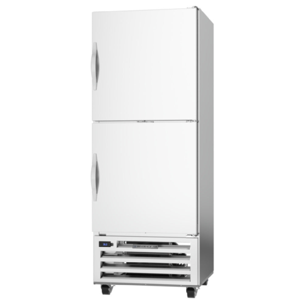 The Beverage Air RI18HC-HS Reach-in Refrigerator is a versatile and efficient refrigeration unit designed for various commercial applications. This one-section refrigerator offers a substantial storage capacity of 16.85 cubic feet, making it suitable for businesses that require reliable refrigeration solutions. It features two solid hinged half doors, ensuring easy access while maintaining the internal temperature. Inside, the refrigerator is equipped with five adjustable shelves, allowing for flexible storage configurations. The LED interior lighting enhances visibility, making it easier to locate stored items. Its bottom-mounted self-contained refrigeration system uses R290 Hydrocarbon refrigerant, which is environmentally friendly. The stainless steel exterior and interior provide durability and ease of cleaning, making it ideal for rigorous commercial use. Mounted on 3-inch casters, the unit offers mobility for easy placement within a workspace. With a 1/4 HP motor, this refrigerator is both powerful and efficient. It carries the cULus, UL EPH Classified, and UL-Sanitation certifications, ensuring compliance with safety and sanitation standards. Proudly made in the USA, the Beverage Air RI18HC-HS Reach-in Refrigerator stands out for its robust build and reliable performance, catering to the needs of restaurants, catering services, and food retail environments.