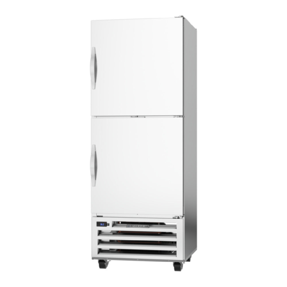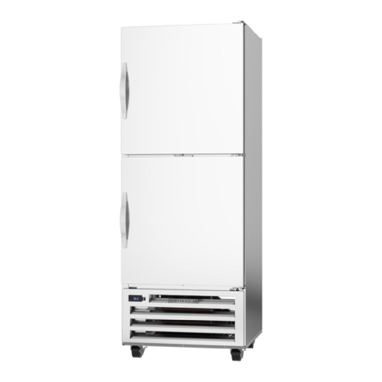 The Beverage Air RID18HC-HS Refrigerator Pass-Thru One-section is a versatile refrigeration unit designed for various commercial applications, offering a storage capacity of 18.38 cubic feet. This refrigerator features four solid hinged half doors and five adjustable shelves, providing ample configuration options for storing diverse products, making it ideal for restaurants, cafes, and food service establishments. Its LED interior lighting ensures excellent visibility, enhancing ease of access and inventory management. The bottom-mounted self-contained refrigeration system utilizes R290 Hydrocarbon refrigerant and a 1/4 horsepower compressor for efficient cooling performance. Constructed with a durable stainless steel exterior and interior, this unit ensures long-lasting durability and easy cleaning. It is equipped with 3-inch casters, facilitating effortless mobility and repositioning within any workspace. The Beverage Air RID18HC-HS is cULus, UL EPH Classified, and UL-Sanitation certified, highlighting its adherence to high safety and sanitation standards. Proudly made in the USA, this refrigerator is a reliable choice for maintaining superior cooling and storage capabilities in professional kitchen environments, promising consistent performance and durability across different industry segments.