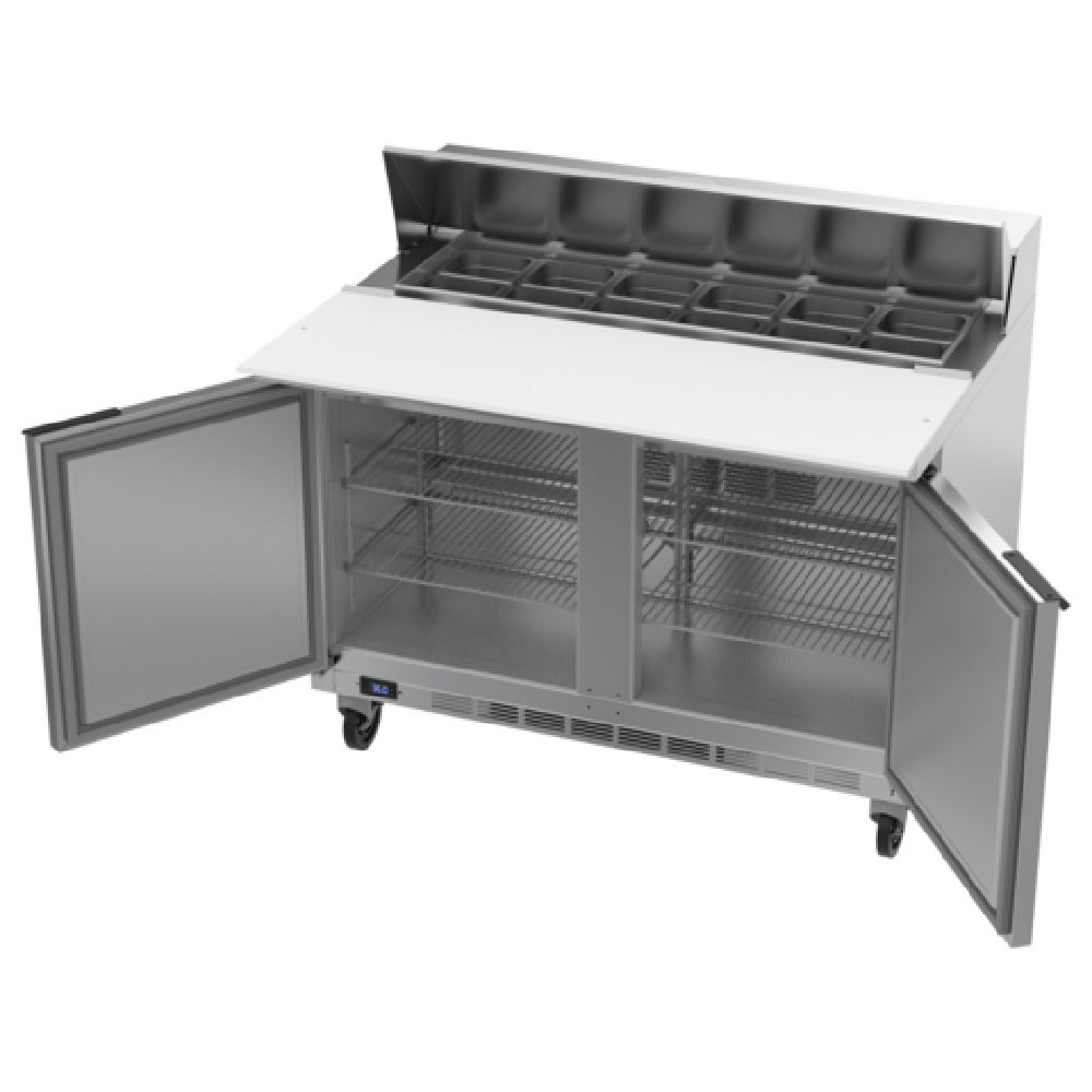 The Beverage Air SPE48HC-12C Sandwich Top Refrigerated Counter is a two-section unit with a 48-inch width and a storage capacity of 13.01 cubic feet, tailored for efficient food preparation in commercial kitchens. This refrigerated counter features two doors and a stainless steel top designed to accommodate twelve 1/6 size pans, with the capability to support 6-inch deep pans despite the 4-inch depth of the included pans. A 17-inch cutting board enhances its utility for sandwich and salad assembly. The counter includes four shelves to optimize storage and organization. It is constructed with a robust stainless steel exterior and an aluminum interior, ensuring durability and easy maintenance. The rear-mounted self-contained refrigeration system utilizes R290 Hydrocarbon refrigerant, promoting eco-friendly operations. Powered by a 1/6 HP compressor, the unit is designed for energy efficiency. This product meets cULus, UL EPH Classified, and UL-Sanitation standards, ensuring compliance with industry safety and sanitation requirements. Proudly made in the USA, the Beverage Air SPE48HC-12C is ideal for delis, cafes, and restaurants seeking a reliable and efficient refrigerated food prep station.