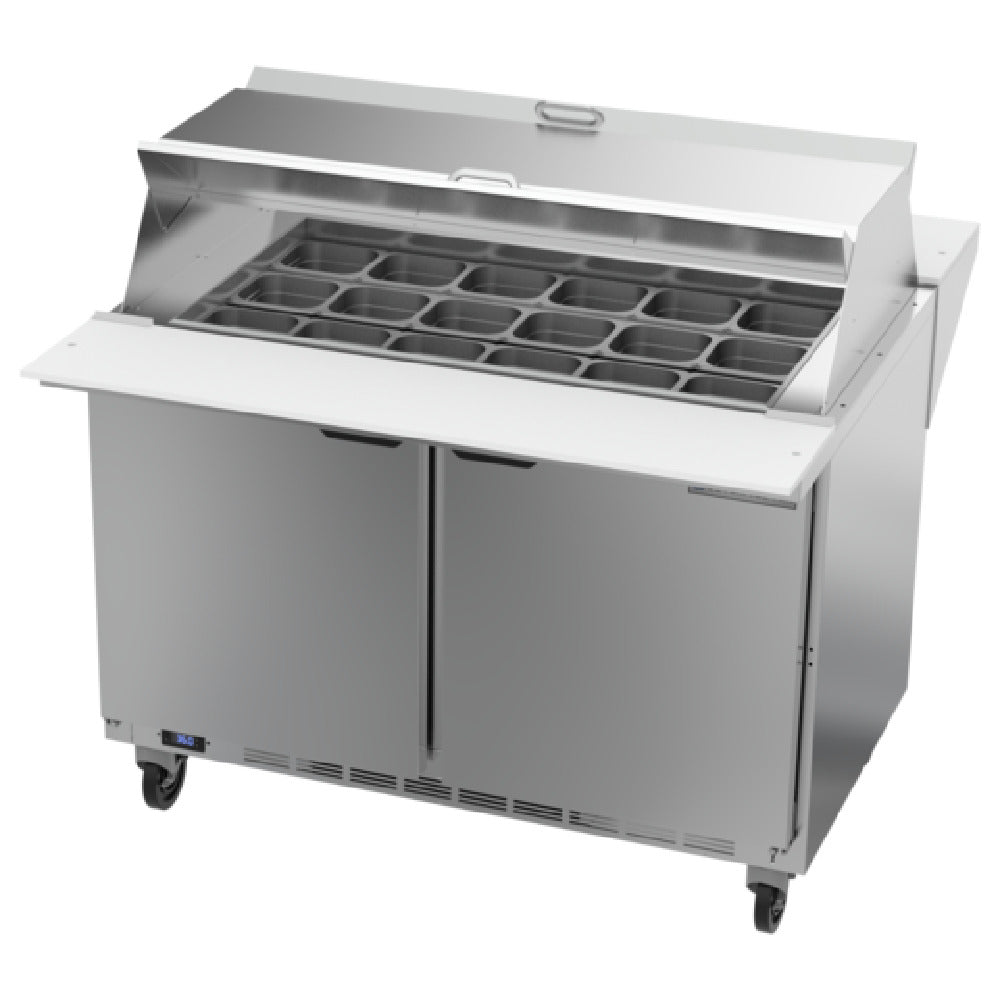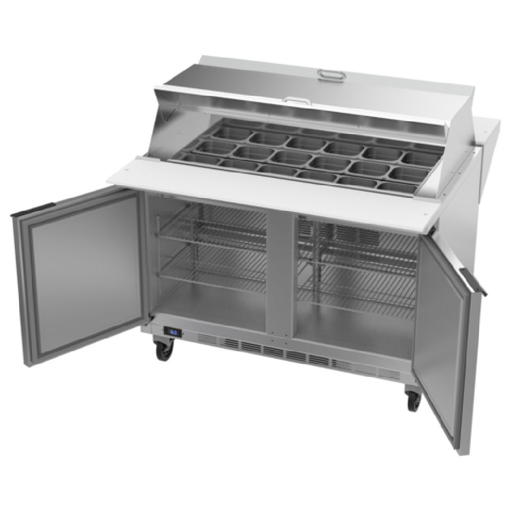 The Beverage Air SPE48HC-18M-DS Dual Side Mega Top Refrigerated Counter is engineered for high-demand environments, offering exceptional performance and functionality. This two-section unit measures 48 inches in width and provides a substantial storage capacity of 13.01 cubic feet. Featuring two durable doors, this counter is designed with a stainless steel top, accommodating up to eighteen 1/6 size pans with a depth of 4 inches, while being capable of supporting 6-inch deep pans. Two cutting boards, measuring 10 inches and 12 inches respectively, enhance its utility for food preparation tasks. Inside, four shelves allow organized storage, surrounded by an aluminum interior that complements its robust stainless steel exterior. The rear-mounted, self-contained refrigeration system utilizes R290 Hydrocarbon refrigerant and operates with a power-efficient 1/6 HP motor. Certified by cULus, UL EPH, and UL-Sanitation, this product meets stringent safety and sanitation standards, ensuring reliability in professional settings. Proudly made in the USA, the Beverage Air SPE48HC-18M-DS is an ideal choice for culinary professionals seeking a versatile, durable, and efficient refrigerated counter that supports various food service applications and industry needs with precision and quality.