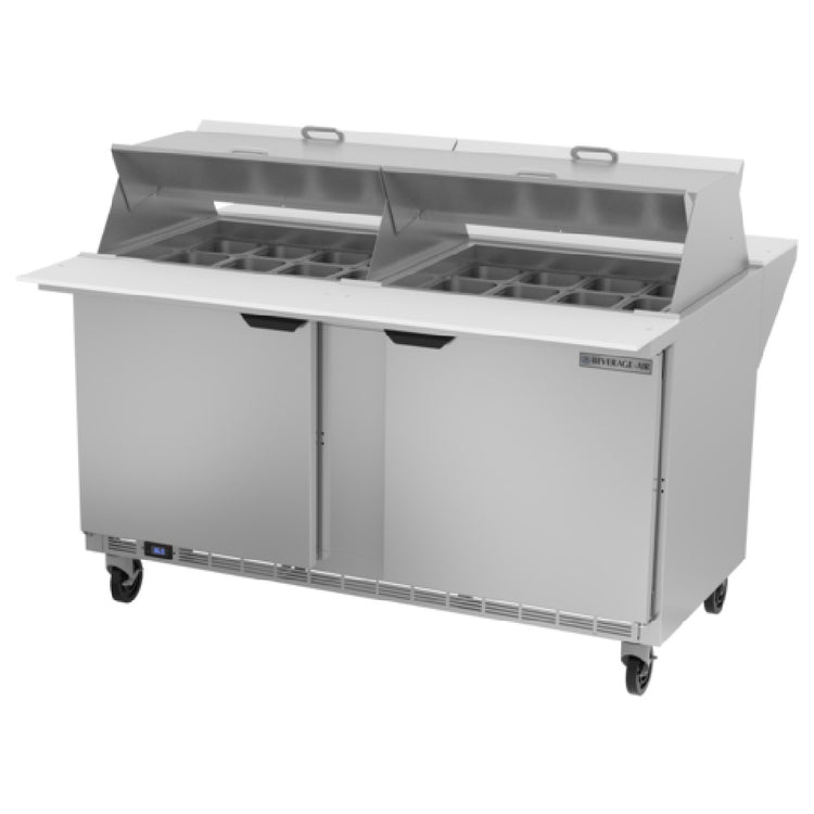 The Beverage Air SPE60HC-24M-DS Dual Side Mega Top Refrigerated Counter is a versatile two-section unit, ideal for commercial kitchens seeking high-capacity refrigeration solutions. Measuring 60 inches in width, it offers a substantial 16.02 cubic feet capacity, designed to accommodate a variety of storage needs. This model features two sturdy doors and a stainless steel top with designated openings for twenty-four 1/6 size pans, enhancing its utility for food preparation tasks. Included are a 10-inch and a 12-inch cutting board, providing ample workspace for seamless kitchen operations. The unit is equipped with four shelves, optimizing storage efficiency, while its stainless steel exterior and galvanized steel exterior bottom underscore its durability and strength. An aluminum interior contributes to effective temperature maintenance. The rear-mounted self-contained refrigeration system utilizes R290 Hydrocarbon refrigerant and operates with a 1/3 horsepower motor, ensuring energy-efficient cooling. Designed to fit 4-inch deep pans but also accommodating 6-inch deep pans, it offers flexibility in storage configurations. Certified by cULus, UL EPH, and UL-Sanitation, this refrigerated counter meets stringent safety and sanitation standards. Proudly made in the USA, the Beverage Air SPE60HC-24M-DS is an essential asset for food service establishments prioritizing reliability and performance in their refrigeration equipment.