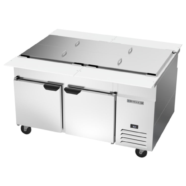 The Beverage Air SPE60HC-32M-PT Mega Top Refrigerated Pass-Thru Counter is a premier two-section refrigeration unit designed for efficiency and capacity. Measuring 60 inches in width with a 17 cubic foot capacity, this unit is equipped with four doors for easy access and convenience. The stainless steel top is engineered with openings for thirty-two 1/6 size pans, with the capability to accommodate pans up to 6 inches deep, making it highly versatile for various culinary applications. Two 10-inch cutting boards add to its functionality, alongside four durable shelves for enhanced storage solutions. The unit boasts a robust stainless steel exterior on the top, front, sides, and doors, complemented by a galvanized steel bottom and an aluminum interior. The side-mounted self-contained refrigeration system utilizes R290 Hydrocarbon refrigerant and operates with a 1/3 horsepower motor, delivering optimal cooling performance. This pass-thru counter is cULus, UL EPH Classified, and UL-Sanitation certified, ensuring compliance with stringent safety and sanitation standards. Manufactured in the USA, the Beverage Air SPE60HC-32M-PT is ideal for commercial kitchens seeking a reliable, high-capacity refrigeration solution that seamlessly integrates into a variety of food service environments.