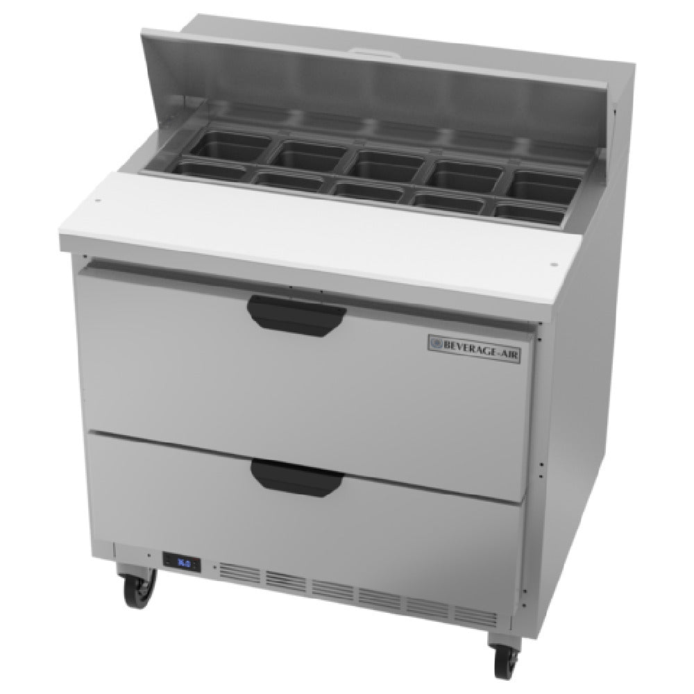 The Beverage Air SPED36HC-10-2 Sandwich Top Refrigerated Counter is a highly efficient refrigeration solution designed specifically for commercial kitchen environments. This one-section unit, measuring 36 inches in width, provides a generous 10.01 cubic feet of refrigerated space. It features two pull-out drawers that can accommodate 6-inch deep pans, enhancing storage flexibility for food preparation needs. The stainless steel top is tailored with openings for ten 1/6 size pans, with the capability to hold pans up to 6 inches deep, while the unit comes furnished with 4-inch deep pans. A 10-inch polyethylene cutting board offers a convenient workspace for quick assembly of salads and sandwiches. Constructed with a robust stainless steel exterior and an aluminum interior, this unit ensures durability and ease of maintenance. Its rear-mounted, self-contained refrigeration system uses environmentally friendly R290 Hydrocarbon refrigerant, supported by a 1/6 HP compressor for efficient cooling. This product meets cULus, UL EPH Classified, and UL-Sanitation standards, emphasizing its compliance with industry safety regulations. Made in the USA, the Beverage Air SPED36HC-10-2 is an ideal choice for delis, restaurants, and food service operations seeking reliable and versatile refrigerated storage.