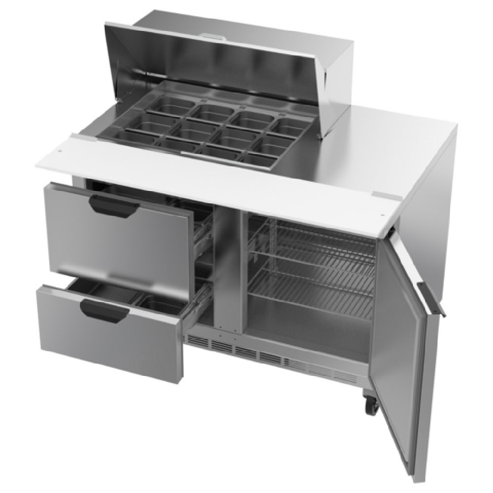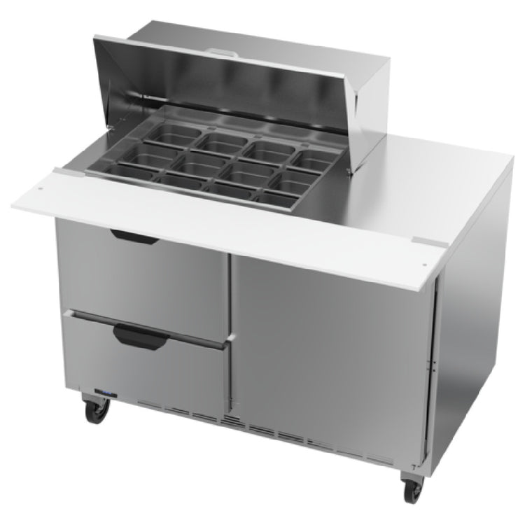 The Beverage Air SPED48HC-12M-2 Mega Top Refrigerated Counter is a two-section, 48-inch-wide unit designed with precision for efficient food prep and storage. It boasts a capacity of 13.01 cubic feet, making it suitable for various culinary environments. The counter features two drawers, with upper and lower pull-out designs that accommodate 6-inch deep pans, alongside a single door and two shelves for versatile storage options. Its stainless steel top includes openings for twelve 1/6 size pans, with provided pans being 4 inches deep, but capable of handling up to 6-inch deep pans. For added convenience, a 10-inch polyethylene cutting board is integrated into the design. The counter's exterior is constructed from durable stainless steel, while the interior is made from aluminum. Its rear-mounted, self-contained refrigeration system uses R290 Hydrocarbon refrigerant and operates with a 1/6 horsepower motor. This unit is cULus, UL EPH Classified, and UL-Sanitation certified, ensuring it meets rigorous safety and sanitation standards. Proudly made in the USA, the Beverage Air SPED48HC-12M-2 is an ideal choice for those in the hospitality or food service industries seeking reliable refrigeration with thoughtful storage solutions and robust performance.