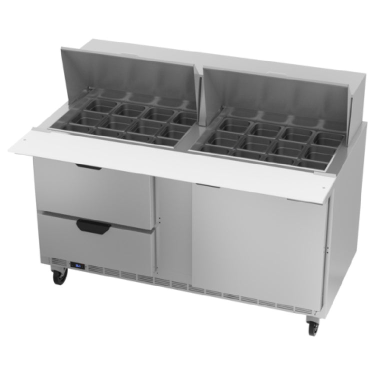 The Beverage Air SPED60HC-24M-2 Mega Top Refrigerated Counter is a versatile two-section unit designed for efficient food preparation and storage, measuring 60 inches in width. With a capacity of 16 cubic feet, it features a combination of two pull-out drawers and one door, suitable for accommodating 6-inch deep pans. The top is stainless steel with openings designed for 24 1/6 size pans, though it comes with 4-inch deep pans. It includes a 10-inch polyethylene cutting board for added convenience. The exterior is crafted from stainless steel with a galvanized steel back and bottom, while the interior is aluminum, ensuring durability and ease of cleaning. This unit is equipped with a rear-mounted self-contained refrigeration system that uses R290 Hydrocarbon refrigerant and is powered by a 1/3 HP motor. Certification by cULus, UL EPH Classified, and UL-Sanitation highlights its compliance with safety standards. Made in the USA, this refrigerated counter is an ideal solution for commercial kitchens, offering ample capacity and robust construction for food service operations, delis, and catering environments that require reliable and efficient refrigeration solutions.