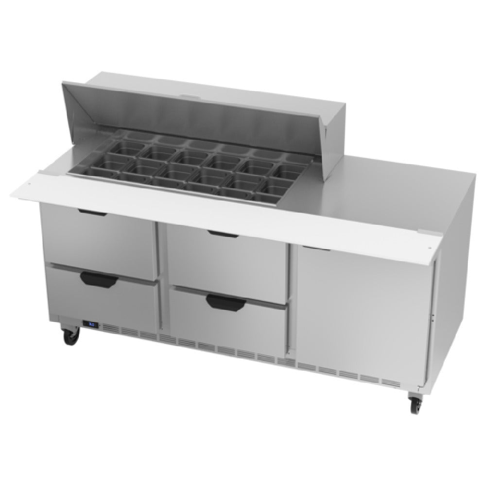 The Beverage Air SPED72HC-18M-4 Mega Top Refrigerated Counter is a versatile and robust refrigeration unit designed for optimal food storage and preparation in commercial kitchens. Spanning 72 inches wide, this three-section unit offers a generous 20.0 cubic feet capacity, providing ample space for storing ingredients. The unit features four drawers, both upper and lower, that can accommodate 6-inch deep pans, enhancing its storage flexibility. Additionally, it includes one door and two shelves to maximize organizational efficiency. The stainless steel top is designed with openings for eighteen 1/6 size pans, with the capability to hold pans up to 6 inches deep. A 10-inch polyethylene cutting board is integrated for convenient food prep. Constructed with a stainless steel exterior and a galvanized steel back and bottom, this counter ensures durability and longevity. The aluminum interior supports efficient cooling, powered by a rear-mounted, self-contained refrigeration system using R290 Hydrocarbon refrigerant for eco-friendly operation. With a 1/3 HP compressor, it is cULus, UL EPH Classified, and UL-Sanitation certified, reflecting its adherence to stringent safety and sanitation standards. Made in the USA, the Beverage Air SPED72HC-18M-4 is ideal for restaurants, catering businesses, and other food service operations seeking reliable refrigeration solutions.