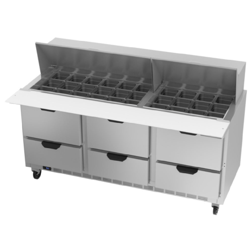 The Beverage Air SPED72HC-30M-6 Mega Top Refrigerated Counter is a versatile three-section unit with a generous width of 72 inches, providing a substantial 20.0 cubic feet of storage space. This counter is uniquely designed with six pull-out drawers, both upper and lower, capable of accommodating 6-inch deep pans, making it suitable for a variety of food service applications. The stainless steel top is innovatively designed to hold up to thirty 1/6 size pans—supplied pans are 4 inches deep, but the top can support pans up to 6 inches deep. The unit is equipped with a 10-inch polyethylene cutting board, enhancing its functionality as a prep station. Constructed with a stainless steel exterior and a galvanized steel back and bottom, it boasts an aluminum interior that ensures durability and easy maintenance. The counter features a rear-mounted, self-contained refrigeration system utilizing R290 Hydrocarbon refrigerant, driven by a 1/3 horsepower motor, delivering efficient cooling performance. This model is classified under cULus, UL EPH, and UL-Sanitation certifications, attesting to its quality and safety standards. Proudly made in the USA, the Beverage Air SPED72HC-30M-6 is a reliable choice for any commercial kitchen seeking a robust refrigeration solution with ample storage and prep capabilities.