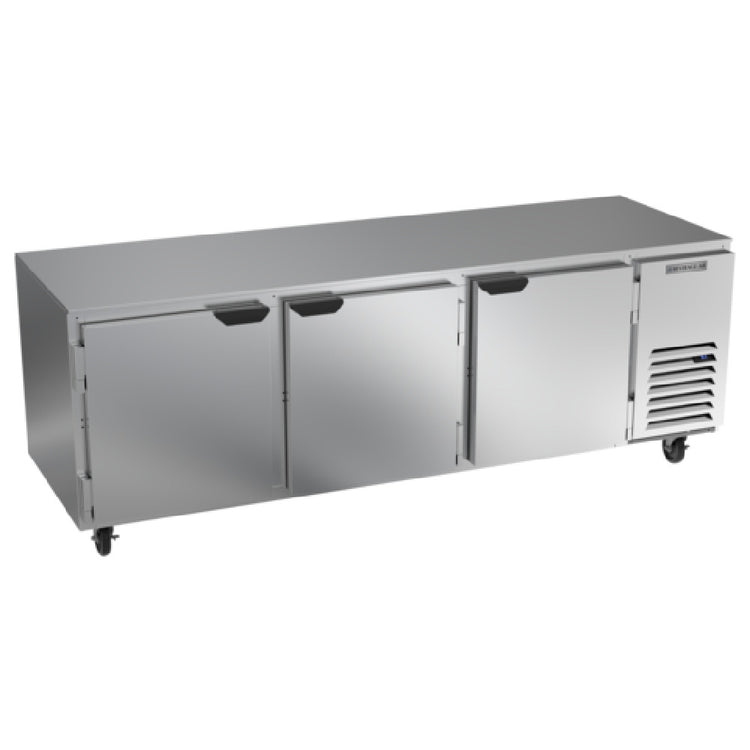 The Beverage Air UCR93AHC Undercounter Side-Mount Refrigerator is a high-capacity refrigeration unit, ideal for various segments within the food service industry, including restaurants, cafes, and catering services. This robust three-section refrigerator spans 93 inches in width and offers a generous 29.7 cubic feet of storage capacity. It features three sturdy doors and six adjustable shelves, providing ample space for organizing and storing a variety of perishable items. The exterior is crafted from stainless steel encompassing the front, sides, door, top, and grille, ensuring durability and a professional appearance. The interior is lined with aluminum, offering a lightweight yet resilient storage environment. The refrigerator utilizes a side-mounted self-contained refrigeration system, which is powered by R290 Hydrocarbon refrigerant and a 1/3 HP compressor, promoting energy efficiency and environmental sustainability. Certified by cULus, UL EPH Classified, and UL-Sanitation standards, this refrigerator is manufactured in the USA, assuring compliance with high safety and sanitation criteria. The Beverage Air UCR93AHC is designed to seamlessly integrate into compact spaces while delivering reliable refrigeration performance, making it a valuable asset for businesses seeking to maximize their kitchen efficiency.
