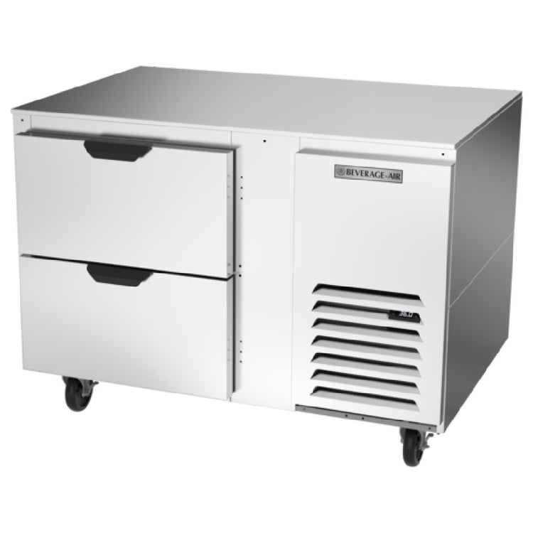The Beverage Air UCRD46AHC-2 Undercounter Refrigerator is a one-section unit designed with precision for diverse refrigeration needs across various industries. Measuring 46 inches in width and providing an ample 16.7 cubic feet of storage capacity, this refrigerator is engineered to fit seamlessly under counters for efficient space utilization. It features two robust drawers, offering flexibility and convenience in organizing contents. The exterior, crafted from stainless steel on the front, sides, and top, ensures durability and a sleek appearance, while the aluminum interior is designed for longevity and ease of cleaning. The side-mounted self-contained refrigeration system utilizes R290 Hydrocarbon refrigerant, an eco-friendly option that aligns with sustainability goals. Powered by a 1/5 HP motor, it delivers reliable cooling performance. Certifications from cULus, UL EPH Classified, and UL-Sanitation affirm its compliance with stringent safety and sanitation standards, making it a dependable choice for professional settings. Proudly manufactured in the USA, the Beverage Air UCRD46AHC-2 combines efficiency, reliability, and sustainability, making it an exceptional fit for restaurants, cafes, and commercial kitchens seeking to optimize their undercounter refrigeration solutions.