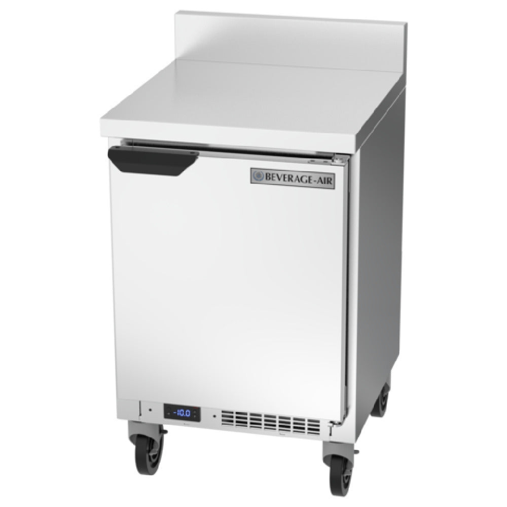 The Beverage Air WTF20HC-FIP Worktop Freezer One-section 20"W is a compact yet efficient solution for foodservice establishments seeking reliable freezer capacity in a limited space. With a 2.27 cu. ft. capacity, this freezer offers ample storage within its single solid door unit, making it suitable for small kitchens or specialized sections of larger operations. Its design includes two shelves to help organize contents efficiently. The exterior is constructed with durable stainless steel on the top, front, sides, door, and grille, while the back and bottom are made of galvanized steel, ensuring longevity and resistance to wear. Inside, an aluminum interior promotes a hygienic environment. A 4" foamed-in place backsplash enhances cleanliness by preventing food and debris from falling behind the unit. The rear-mounted, self-contained refrigeration system utilizes R290 Hydrocarbon refrigerant, an environmentally friendly option, and operates with a 1/4 HP compressor. Classified under cULus, UL EPH, and UL-Sanitation standards, this unit meets rigorous safety and health requirements. Proudly made in the USA, the Beverage Air WTF20HC-FIP is crafted for versatility and performance, ideal for diverse market segments needing a reliable worktop freezer with robust construction and efficient design features.