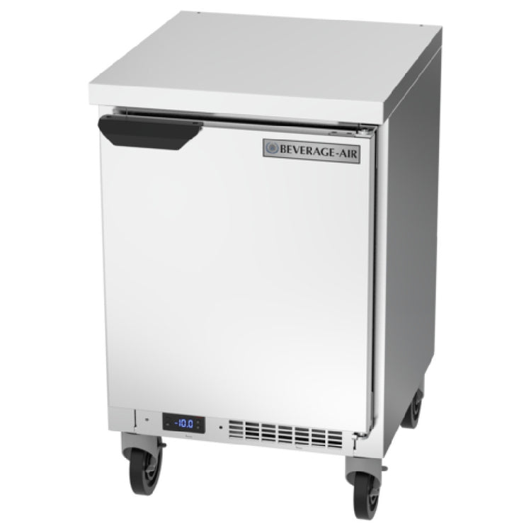 The Beverage Air WTF20HC-FLT Worktop Freezer One-section 20"W is a state-of-the-art compact refrigeration solution designed for a variety of commercial applications. With a 2.27 cu. ft. capacity, this unit offers a streamlined storage facility, accommodating diverse needs in tight spaces. It features a single solid door and comes equipped with two sturdy shelves, providing efficient organization for your frozen goods. The exterior is crafted from premium stainless steel, covering the top, front, sides, door, and grille, which ensures durability and an appealing aesthetic. The rear and bottom are constructed from galvanized steel, while the interior boasts aluminum, enhancing its resilience and longevity. The flat top design allows for additional workspace or equipment placement, maximizing utility in professional kitchens. This freezer employs a rear-mounted self-contained refrigeration system, optimized with R290 Hydrocarbon refrigerant, which is environmentally friendly and efficient. Powered by a 1/4 HP motor, this unit guarantees reliable performance. It is cULus, UL EPH Classified, and UL-Sanitation certified, meeting rigorous safety and sanitation standards. Proudly made in the USA, the Beverage Air WTF20HC-FLT presents a valuable asset for businesses seeking quality, efficiency, and environmental responsibility in their refrigeration needs.