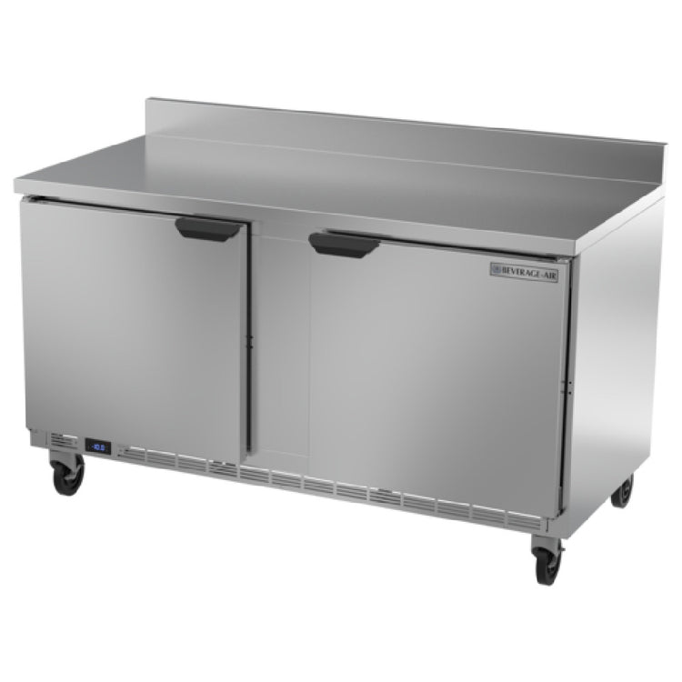 The Beverage Air WTF60AHC-FIP Worktop Freezer is a two-section unit with a 60"W footprint, providing a substantial storage capacity of 14.39 cubic feet. It features two solid doors and comes equipped with four shelves, allowing for organized storage solutions. The freezer is designed with snap-in door gaskets to ensure a secure seal, maintaining optimal temperature conditions. The exterior is constructed with durable stainless steel on the top, front, sides, door, and grille, while the back and bottom are made of galvanized steel, offering robust protection and longevity. Inside, the freezer is lined with aluminum, which contributes to its lightweight and efficient design. A 4" foamed-in-place backsplash provides additional functionality and cleanliness. The refrigeration system is rear-mounted and self-contained, utilizing R290 Hydrocarbon refrigerant, which is both eco-friendly and efficient. With a power output of 1/2 HP, this unit is classified under cULus, UL EPH, and UL-Sanitation standards, ensuring compliance with stringent safety and health requirements. Proudly made in the USA, the Beverage Air WTF60AHC-FIP Worktop Freezer is a reliable and efficient solution for various sectors in the food service industry, offering robust construction and advanced refrigerant technology.