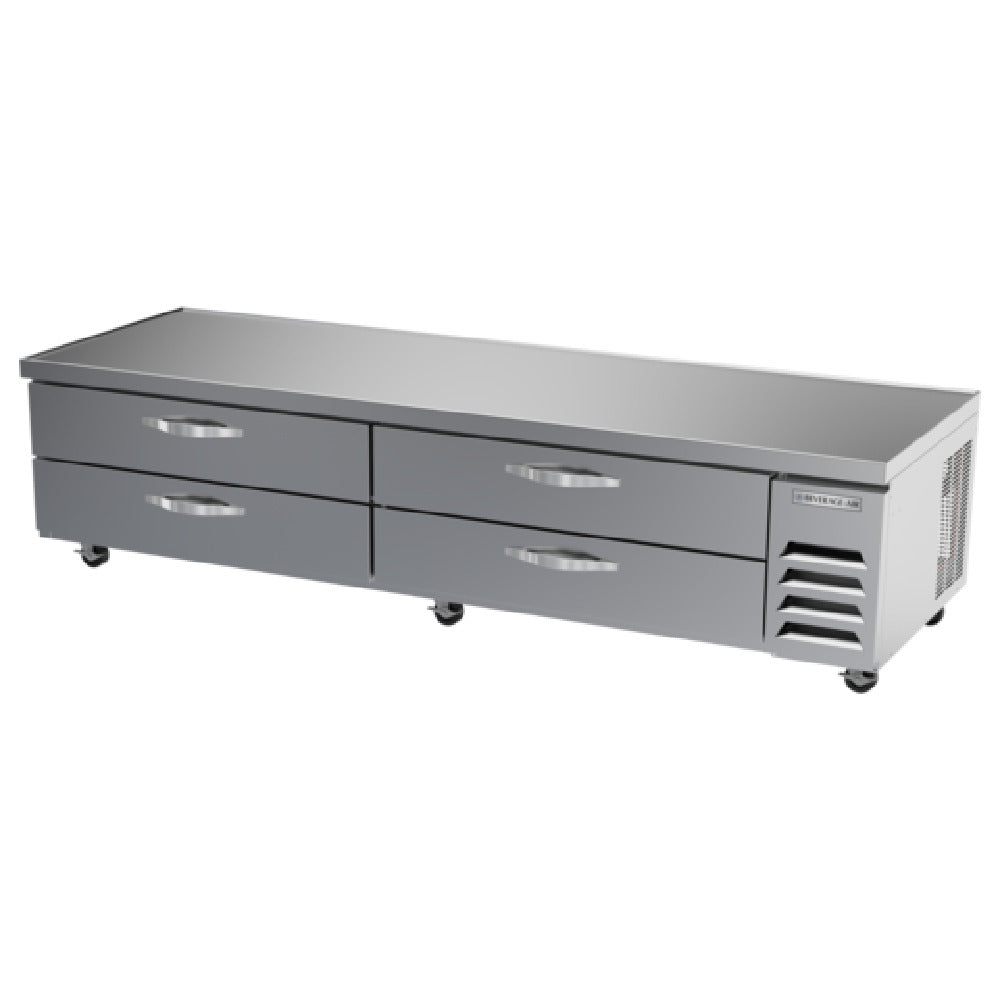 The Beverage Air WTFCS96HC Worktop Cook Stand Freezer is a two-section unit measuring 96 inches wide, designed to meet the rigorous demands of commercial kitchens. With a generous capacity of 20.42 cubic feet, this freezer features four drawers, each accommodating up to three 12" x 20" x 6" pans per drawer, providing ample storage for diverse culinary requirements (pans not included). The unit boasts a digital display for precise temperature control, enhancing operational efficiency. Crafted with a fire-proof stainless steel top, front, and sides, it eliminates the need for a heat shield, positioning it as a safe and robust choice for intense kitchen environments. The full marine drip guard and aluminum interior ensure durability and ease of maintenance. Utilizing R290 Hydrocarbon refrigerant, the self-contained refrigeration system is both eco-friendly and efficient, supported by a powerful 3/4 horsepower motor. Certified by cULus, UL EPH Classified, and UL-Sanitation, this freezer adheres to stringent safety and sanitation standards. Proudly made in the USA, the Beverage Air WTFCS96HC is engineered for reliability and practicality, making it an indispensable asset for restaurants, catering services, and institutional kitchens aiming for high performance and sustainability.