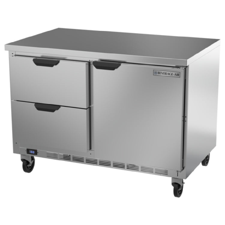 The Beverage Air WTFD48AHC-2-FLT Worktop Freezer is a two-section, 48-inch-wide unit offering a versatile storage solution with a capacity of 11.04 cubic feet. This model is engineered with two drawers, one solid door, and two shelves, providing ample space for organized storage. Notably, it features snap-in door gaskets for enhanced sealing and temperature maintenance. The exterior boasts a stainless steel front, complemented by 2-1/2-inch-thick top and sides, ensuring durability and robust construction. Inside, the aluminum interior supports easy cleaning and maintenance. The flat top design caters to diverse commercial kitchen setups, while the rear-mounted self-contained refrigeration system ensures efficient temperature control. Utilizing R290 Hydrocarbon refrigerant and powered by a 1/2 HP motor, this freezer is both environmentally friendly and powerful. Complying with cULus, UL EPH Classified, and UL-Sanitation standards, the Beverage Air WTFD48AHC-2-FLT is manufactured in the USA, emphasizing quality and reliability. This worktop freezer is ideal for restaurants and food service operations that require dependable refrigeration with a compact footprint, combining advanced technology with practical design to meet the varied demands of different industry segments.