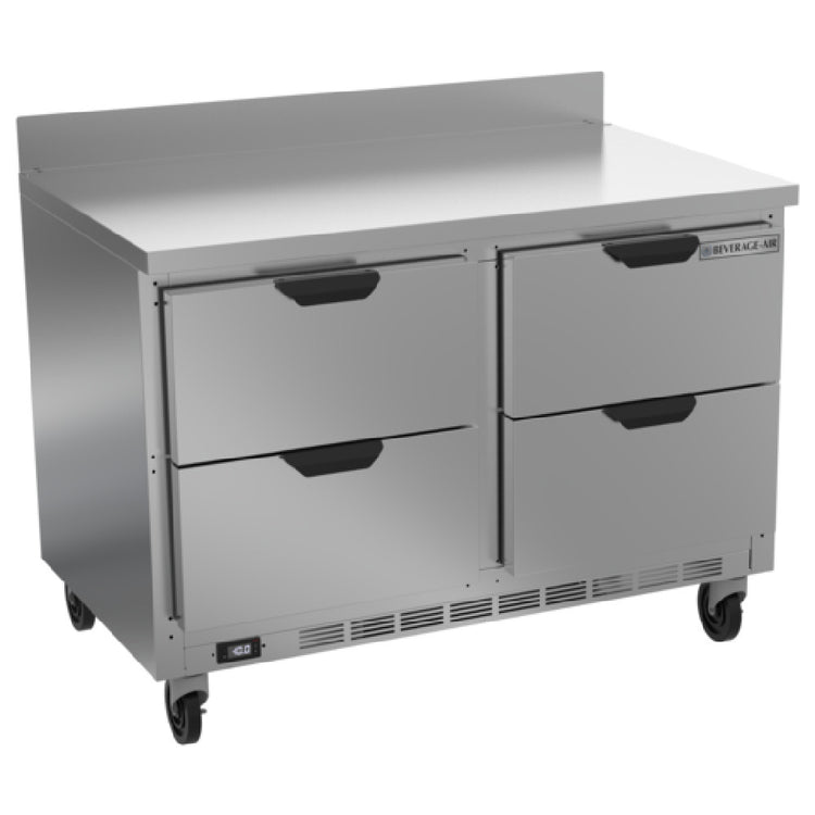 The Beverage Air WTFD48AHC-4 Worktop Freezer is a two-section unit with a compact 48-inch width, designed to maximize space efficiency in commercial kitchen environments. This versatile freezer provides 11.44 cubic feet of storage capacity across four drawers, making it ideal for storing a variety of frozen goods. The exterior boasts a stainless steel front with a 2-1/2-inch-thick top and sides, ensuring durability and a professional appearance. Inside, the aluminum interior is designed for easy cleaning and long-lasting use. The unit features a 4-inch removable backsplash, adding an extra layer of protection against spills and debris. Its rear-mounted, self-contained refrigeration system utilizes R290 Hydrocarbon refrigerant, which is environmentally friendly. Powered by a 1/2 HP motor, the freezer delivers reliable performance. The Beverage Air WTFD48AHC-4 is cULus and UL EPH Classified, meeting stringent safety and sanitation standards. Made in the USA, this freezer is a dependable choice for foodservice professionals seeking quality and efficiency in their refrigeration solutions.