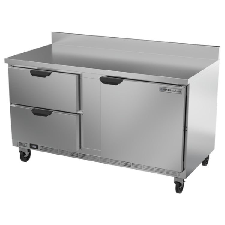 The Beverage Air WTFD60AHC-2-FIP Worktop Freezer is a versatile two-section unit measuring 60 inches in width, making it a practical choice for food service establishments requiring efficient freezer storage combined with workspace functionality. With a capacity of 14.39 cubic feet, this unit features two drawers and one solid door, complemented by two shelves, providing ample configuration options for various storage needs. Constructed with a stainless steel front and 2-1/2 inch thick top and sides, it ensures durability and reliability, ideal for busy commercial kitchens. The aluminum interior and snap-in door gaskets enhance the unit's efficiency and ease of maintenance. A 4-inch foamed-in-place backsplash provides additional protection, maintaining cleanliness and orderliness in the workspace. The rear-mounted self-contained refrigeration system utilizes R290 Hydrocarbon refrigerant, a more environmentally friendly option, powered by a 1/2 HP motor. This worktop freezer is cULus, UL EPH Classified, and UL-Sanitation certified, ensuring compliance with health and safety regulations. Proudly MADE IN USA, the Beverage Air WTFD60AHC-2-FIP embodies quality and robust engineering, making it suitable for a range of market segments within the food service industry, from restaurant kitchens to catering services seeking reliable and efficient refrigeration solutions.