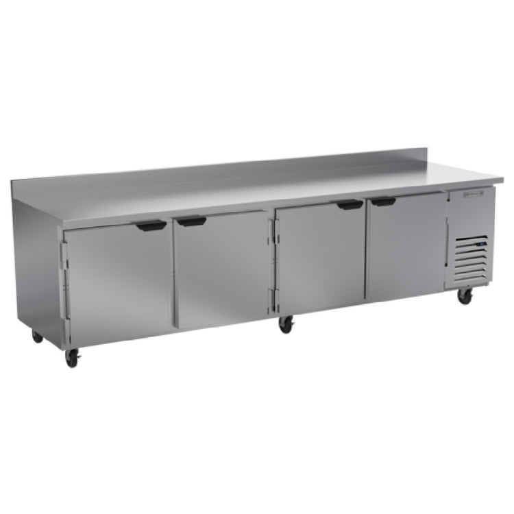 The Beverage Air WTR119AHC Worktop Refrigerator Four-section 118"W is a high-capacity refrigeration unit designed for professional kitchen environments. Featuring a spacious 40.12 cubic feet capacity, this refrigerator is divided into four sections, each secured by its door, providing efficient and organized storage. It comes with eight sturdy shelves to accommodate various storage needs. The exterior is constructed from stainless steel on the front, offering durability and a sleek appearance, while the aluminum interior ensures easy cleaning and maintenance. With a 2-1/2" thick top and sides, this refrigerator is designed for energy efficiency and temperature retention. A 4" high built-in backsplash offers additional protection against spills and debris. The side-mounted, self-contained refrigeration system utilizes R290 Hydrocarbon refrigerant, demonstrating an environmentally-friendly approach without compromising cooling efficiency. Powered by a 1/3 HP motor, the unit ensures reliable performance and consistent temperature maintenance. Certified by cULus, UL EPH, and UL-Sanitation, this refrigerator meets stringent quality and safety standards. Manufactured in the USA, the Beverage Air WTR119AHC is an ideal solution for restaurants, cafeterias, and catering services requiring robust refrigeration with versatile worktop space.