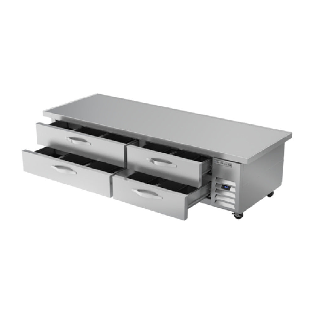 The Beverage Air WTRCS84HC-89 Worktop Cook Stand Refrigerator is a high-capacity, two-section unit designed to meet the rigorous demands of commercial kitchens. Measuring 89 inches in width, this refrigerator offers a substantial 17.46 cubic feet of storage space, making it an essential asset for food service establishments. It features four drawers, each capable of holding pans measuring 12 inches by 20 inches by 6 inches, with the top drawers accommodating three on the left and two on the right, and the bottom drawers offering the same configuration. The refrigerator boasts a fire-proof stainless steel top, front, and sides, eliminating the need for a heat shield and ensuring durability and safety in high-heat environments. A full marine drip guard is included for added protection against spills. Inside, the aluminum interior provides a hygienic storage environment. The side-mounted, self-contained refrigeration system uses R290 Hydrocarbon refrigerant, which is eco-friendly and efficient, powered by a 1/3 HP motor. Certified by cULus, UL EPH Classified, and UL-Sanitation, this refrigerator adheres to strict safety and sanitation standards. Proudly made in the USA, the Beverage Air WTRCS84HC-89 is an ideal choice for professional kitchens seeking reliability and ample refrigerated storage space.