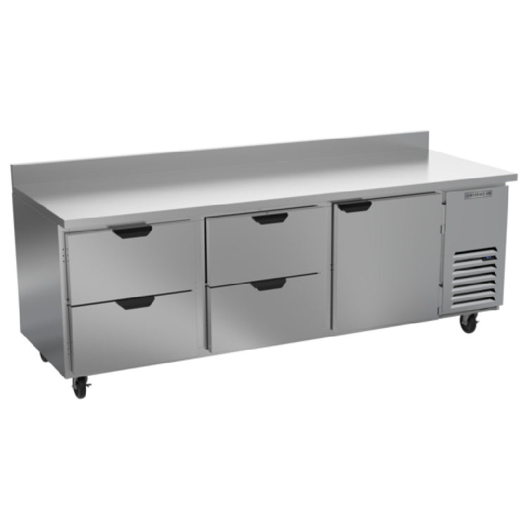 The Beverage Air WTRD93AHC-4 Worktop Refrigerator is a high-performance refrigeration unit designed for commercial kitchens, offering both ample storage and workspace efficiency. It features a three-section construction with a substantial working height of 35-1/2 inches and an impressive width of 93 inches. The unit provides a generous storage capacity of 29.7 cubic feet, divided among four drawers and one door, accompanied by two shelves, making it ideal for organizing a variety of perishable items. The exterior and top are constructed from durable stainless steel with a rear splash, while the interior is made from aluminum, ensuring longevity and ease of cleaning. The side-mounted self-contained refrigeration system employs R290 Hydrocarbon refrigerant, which is both environmentally friendly and efficient, powered by a 1/3 HP motor. This model is cULus, UL EPH Classified, and UL-Sanitation certified, ensuring compliance with the highest safety and sanitation standards. Proudly made in the USA, the Beverage Air WTRD93AHC-4 is a versatile and reliable choice for food service professionals seeking a robust and efficient refrigeration solution that meets the rigorous demands of the industry. Its strategic design and superior specifications make it an invaluable asset for diverse segment markets.