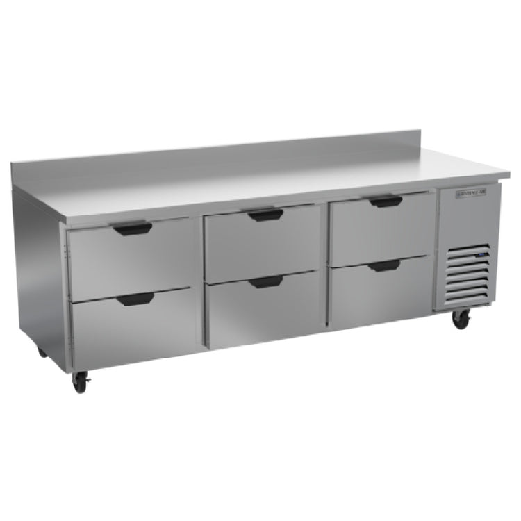 The Beverage Air WTRD93AHC-6 Worktop Refrigerator is a robust refrigeration unit designed for versatile use in various professional settings. This three-section refrigerator boasts a spacious 93-inch width and offers a generous storage capacity of 29.7 cubic feet. Its worktop height of 35-1/2 inches is designed for comfortable access and efficient workspace integration. Featuring a durable stainless steel exterior and top, complemented by an aluminum interior, this refrigerator is built to withstand the demands of busy commercial environments. Its side-mounted, self-contained refrigeration system utilizes R290 Hydrocarbon refrigerant, an environmentally friendly solution, and operates with a 1/3 horsepower motor. This model includes six drawers, optimizing organization and accessibility, while the rear splash provides added protection against spills. The Beverage Air WTRD93AHC-6 is certified by cULus, UL EPH Classified, and UL-Sanitation, ensuring it meets stringent safety and sanitation standards. Proudly made in the USA, this worktop refrigerator is an excellent choice for businesses seeking a reliable, high-capacity refrigeration solution that supports both food preparation and storage needs within the foodservice industry.
