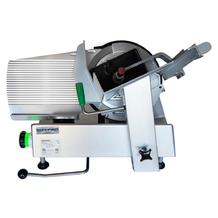 The Bizerba GSP H I 90-K12 Manual Heavy Duty Illuminated Safety Slicer is engineered to meet the demanding needs of various segments within the food industry. This slicer features a 13-inch blade, ensuring precision and consistency in every slice. Its design is centered on user safety and convenience, boasting eight safety interlocks to enhance operational security. The seamless anodized aluminum construction provides durability and easy cleaning, while the high carriage with a 25-degree incline towards the operator and a 40-degree gravity feed optimizes workflow efficiency. The slicer includes a 3.5-inch-wide thumb guard and a removable pusher-plate for added safety and versatility. A remote sharpener with a spring-loaded dial allows for easy blade maintenance. The adjustable slice thickness ranges from 0 to 0.94 inches, catering to diverse slicing requirements. Powered by a 1/2 HP motor, the slicer operates on 120 volts with a single-phase power supply, drawing 3.5 amps and consuming 0.4 kW. It comes equipped with a cord featuring a NEMA 5-15P plug. Certified for sanitation and safety with ETL-Sanitation, UL-157 gaskets and seals, cETLus, and DGUV safety tested, the Bizerba GSP H I 90-K12 slicer is a reliable choice for professional kitchen environments.