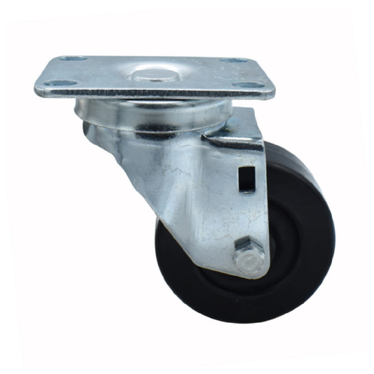 The BK Resources 3SBR-1PT-HR Hard Rubber Wheel, with a diameter of 3 inches and a top plate measuring 2-3/8 inches by 3-5/8 inches, is engineered for durability and smooth operation. This non-marking wheel is ideal for industries requiring reliable mobility solutions, boasting a weight capacity of 300 lbs. It features a 1/2 inch king pin and a double ball bearing system enhanced by a nylon bearing sleeve, ensuring a quiet and smooth glide across surfaces. The wheel's operational temperature range spans from -40°F to 160°F, providing versatility for various environments. Its zinc-plated finish offers a layer of protection against corrosion, enhancing longevity and dependability. Notably, this wheel is constructed without a brake, focusing on seamless, continuous movement, and is NSF certified, reflecting its compliance with health and safety standards. These specifications make the BK Resources 3SBR-1PT-HR wheel a valuable component across multiple sectors, such as food service and industrial settings, where cleanliness and operational efficiency are paramount. Its robust design and high-performance features cater to diverse market needs, ensuring that equipment remains mobile and efficient under varying conditions.