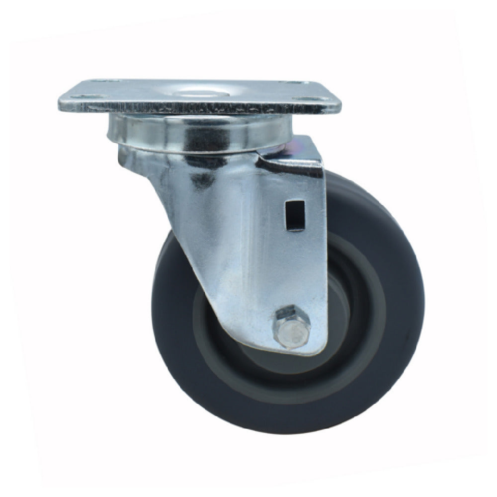 The BK Resources 4SBR-1PT-GR Rubber Wheel is a precision-engineered component featuring a 4-inch diameter, offering versatile solutions for industries requiring reliable mobility options. This wheel is constructed with a 2-3/8" x 3-5/8" top plate and lacks a braking system, optimizing it for applications where continuous movement is essential. The 1/2" king pin ensures secure attachment and stability during use. Designed to be non-marking, it maintains floor integrity across various surfaces, making it ideal for sensitive indoor environments. With a weight capacity of 250 lbs, this wheel supports substantial loads, catering to demanding operational needs. Its operational temperature range from -45°F to 180°F highlights its adaptability in diverse conditions, while its resistance to oil, grease, water, and most solvents ensures longevity and durability. The inclusion of double ball bearings guarantees smooth and quiet operation, enhancing user experience in noise-sensitive areas. The zinc-plated finish provides additional durability and resistance to corrosion. The wheel's gray color complements a range of equipment aesthetics and its NSF certification underscores its compliance with rigorous health and safety standards. The BK Resources 4SBR-1PT-GR Rubber Wheel is a practical and efficient choice for any industry requiring robust, reliable, and non-marking mobility solutions.