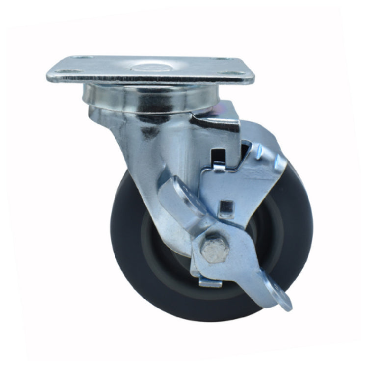 The BK Resources 4SBR-1PT-GR-TLB Rubber Wheel is a versatile and reliable component designed for various industrial applications, featuring a 4-inch diameter that ensures stability and ease of movement. This wheel is equipped with a 2-3/8-inch by 3-5/8-inch top plate, which provides a robust mounting surface, and includes a top lock brake for secure positioning when necessary. With a 1/2-inch king pin, this wheel is built to support a weight capacity of up to 250 pounds, making it suitable for heavy-duty tasks. The non-marking rubber material ensures surfaces remain pristine, while the wheel's operational temperature range of -45°F to 180°F enhances its adaptability in different environments. Resistant to oil, grease, water, and most solvents, this wheel is ideal for settings where exposure to such elements is common. The double ball bearing system guarantees smooth and quiet operation, complemented by the zinc plating that adds a layer of durability. Available in an understated gray color and NSF certified, the BK Resources 4SBR-1PT-GR-TLB Rubber Wheel is a practical choice for industries demanding reliable performance and minimal maintenance. Its thoughtful design makes it a valuable asset across various market segments, from manufacturing to logistics.