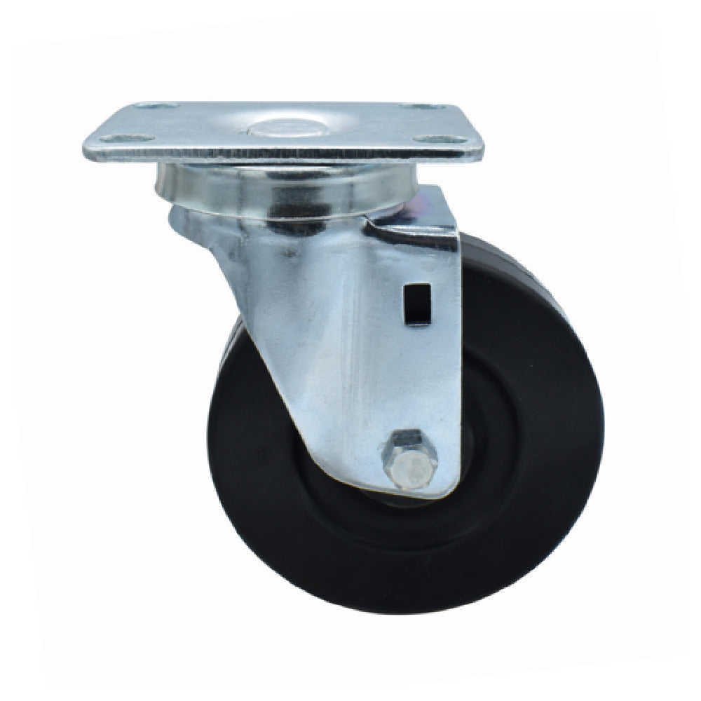 BK Resources 4SBR-1PT-HR Hard Rubber Wheel is a highly reliable component with a 4-inch diameter, designed to provide robust support and mobility for various industrial applications. With a top plate measuring 2-3/8 inches by 3-5/8 inches, this wheel is engineered without a brake feature, making it ideal for use in environments where continuous movement is required. The 1/2-inch king pin ensures a secure attachment, contributing to the wheel's impressive weight capacity of 300 pounds. This product is built to withstand a wide operational temperature range from -40°F to 160°F, providing versatility across different working conditions. The inclusion of a nylon bearing sleeve and double ball bearing technology enhances the wheel's durability and smooth functionality, ensuring consistent performance. Finished with a zinc plating, the wheel is NSF certified, highlighting its compliance with stringent public health and safety standards. The BK Resources 4SBR-1PT-HR Hard Rubber Wheel is particularly suited for sectors demanding reliable and resilient mobility solutions, such as manufacturing facilities, warehousing, and logistics operations, where equipment movement is crucial for operational efficiency.