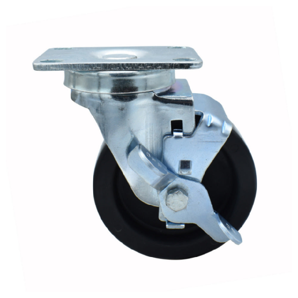 The BK Resources 4SBR-1PT-LDP-TLB Polyolefin Wheel is a high-performance component engineered for various industrial applications, featuring a 4-inch diameter and a top plate size of 2-3/8 inches by 3-5/8 inches. This wheel is equipped with a top lock brake and a 1/2-inch king pin, providing stability and security during use. With a weight capacity of 300 lbs, it is robust enough to support heavy loads, making it suitable for sectors requiring durable and reliable mobility solutions. The operational temperature range spans from -45°F to 180°F, indicating its ability to perform in both extreme cold and high heat environments, adding to its versatility across different work conditions. The nylon bearing sleeve and the double ball bearing system enhance its smooth operation and longevity, while the zinc-plated finish ensures resistance to corrosion, further extending its utility and lifespan. Certified by NSF, this wheel is not only designed for efficient functionality but also adheres to stringent public health and safety standards. The BK Resources 4SBR-1PT-LDP-TLB Polyolefin Wheel is ideal for industries requiring resilient and adaptable material handling solutions, providing excellent value with its superior technical specifications and quality construction.