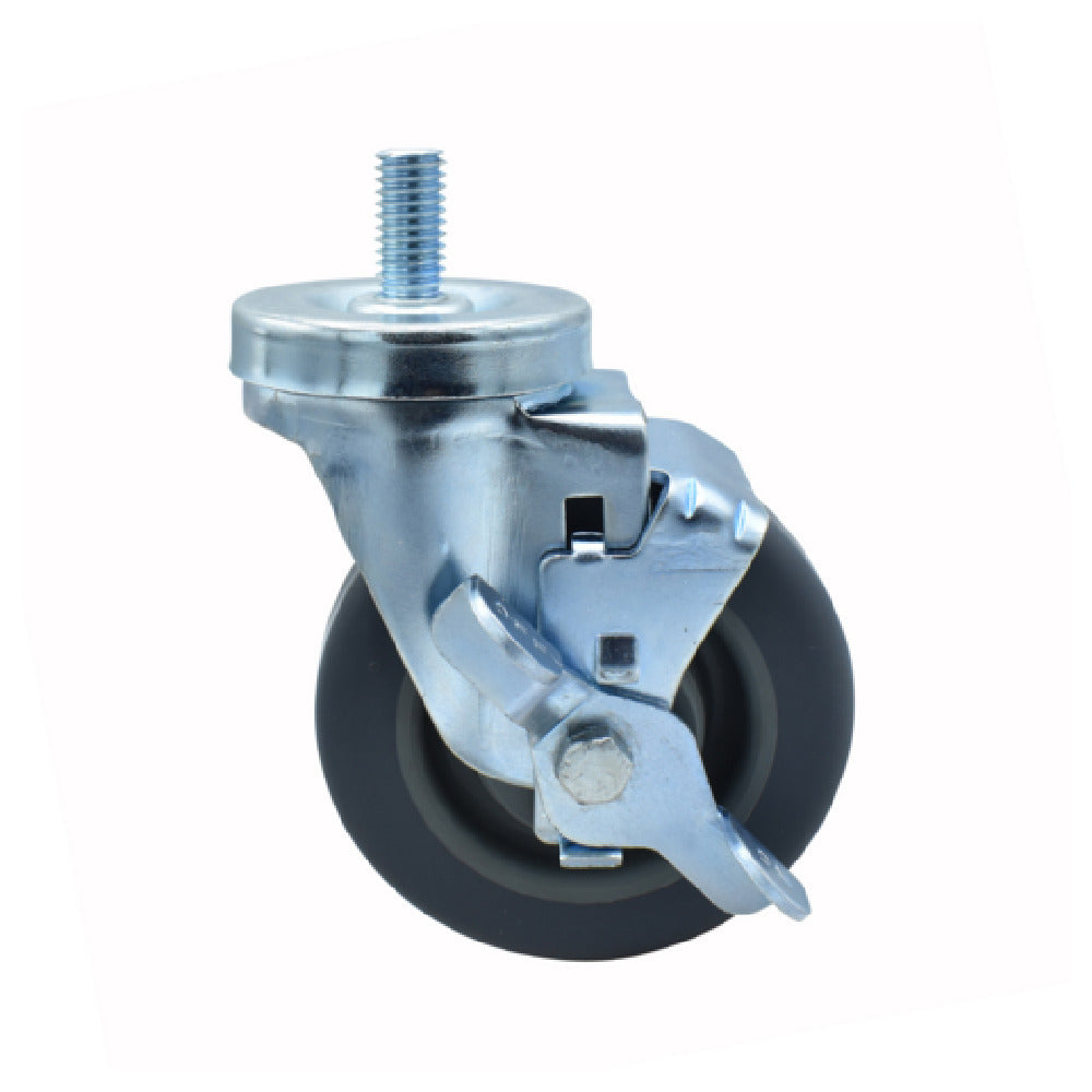 The BK Resources 4SBR-4ST-GR-TLB Rubber Wheel is a meticulously designed component with a 4-inch diameter and features a 1/2"-13 x 1" threaded stem, accompanied by a top lock brake. This rubber wheel is crafted for non-marking performance, supporting a considerable weight capacity of 250 pounds. It is engineered to function seamlessly across a broad operational temperature range of -45°F to 180°F, making it suitable for versatile environments. Its construction is resistant to oil, grease, water, and most solvents, ensuring durability and reliability in demanding conditions. The incorporation of double ball bearings facilitates smooth and quiet operation, enhancing its usability in settings requiring minimal noise interference. Zinc plating adds an extra layer of protection against corrosion, while its gray color complements a variety of industrial and commercial applications. The NSF certification underscores its compliance with stringent safety and quality standards. This wheel is an ideal choice for industries requiring robust, reliable, and efficient mobility solutions, such as manufacturing facilities, warehouses, and food service operations. Its versatility and high-performance characteristics make it a valuable asset across different market segments where mobility and durability are paramount.