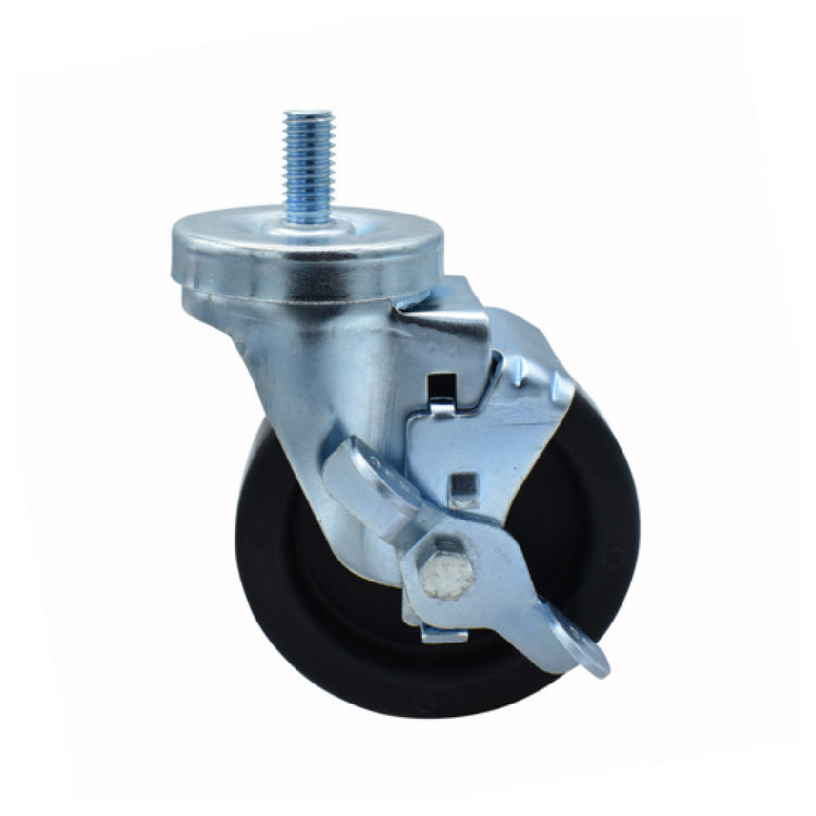 The BK Resources 4SBR-4ST-LDP-TLB Polyolefin Wheel is a versatile component designed for various industrial applications, characterized by its precise engineering and robust specifications. With a 4-inch diameter, this wheel supports a formidable weight capacity of 300 pounds, making it suitable for heavy-duty use in environments demanding high load-bearing capabilities. Featuring a 1/2"-13 x 1" threaded stem, it ensures a secure and stable attachment, enhancing reliability across diverse operations. The top lock brake provides an added layer of safety and control, crucial in environments where stability and precision are paramount. Crafted with double ball bearings, the wheel ensures smooth and efficient movement, reducing operational friction and wear. Zinc plating offers an additional layer of durability, protecting against corrosion and extending the wheel's lifespan even in challenging conditions. The operational temperature range, from -45°F to 180°F, underscores its adaptability to extreme temperatures, making it suitable for a wide range of industrial settings, from cold storage to high-temperature environments. NSF certification further emphasizes its compliance with safety and sanitation standards, catering to industries with stringent hygiene requirements. The BK Resources 4SBR-4ST-LDP-TLB Polyolefin Wheel is an expertly crafted component, engineered to meet the demands of various market segments requiring durable and reliable wheel solutions.