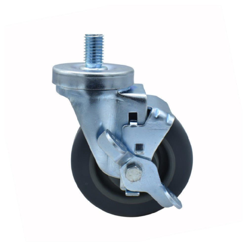 The BK Resources 4SBR-5ST-GR-TLB Rubber Wheel is engineered for versatile and demanding industrial applications, featuring a 4-inch diameter that provides a balanced combination of mobility and stability. With a threaded stem measuring 5/8"-13 x 1", it ensures a secure fit for various carts and equipment. This wheel is equipped with a top lock brake for enhanced safety, making it suitable for environments where stability is critical. Its non-marking design prevents surface damage, maintaining the aesthetic integrity of floors while supporting a substantial weight capacity of 250 lbs. The wheel is capable of operating in an impressive temperature range of -45°F to 180°F, making it adaptable to extreme conditions. Its resistance to oil, grease, water, and most solvents enhances its durability and reliability in challenging environments. The double ball bearing construction guarantees smooth and quiet operation, essential for noise-sensitive settings. Finished with zinc plating, the wheel offers added protection against corrosion, ensuring long-term performance. The gray color option provides a subtle, professional appearance, and its NSF certification highlights compliance with safety and quality standards. The BK Resources 4SBR-5ST-GR-TLB Rubber Wheel stands out as a robust solution for industries requiring reliable and efficient mobility solutions.