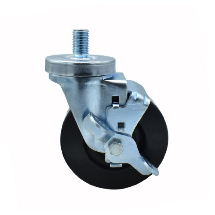 BK Resources 4SBR-5ST-HR-TLB Hard Rubber Wheel 4" Diameter 5/8"-13 X 1" Threaded Stem is engineered to meet the demands of various industrial applications with precision. Featuring a 4-inch diameter, this wheel incorporates a 5/8"-13 x 1" threaded stem, ensuring compatibility with diverse equipment configurations. The inclusion of a top lock brake enhances operational stability and safety, especially crucial in dynamic environments. With a robust weight capacity of 300 pounds, it is suited for heavy-duty tasks. This wheel's operational temperature range of -40° to 160° F makes it adaptable across extreme conditions, making it an invaluable asset in cold storage or high-heat industries. The nylon bearing sleeve and double ball bearing construction contribute to its smooth maneuverability and longevity, reducing maintenance needs. Zinc plating reinforces its durability and resistance to corrosion, assuring long-term reliability. NSF certification underscores its compliance with stringent safety and sanitation standards, making it a trusted choice for environments where hygiene is paramount. The BK Resources hard rubber wheel is an optimal solution for a wide spectrum of industries, from food service to manufacturing, where durable, reliable, and versatile mobility solutions are critical for operational efficiency.