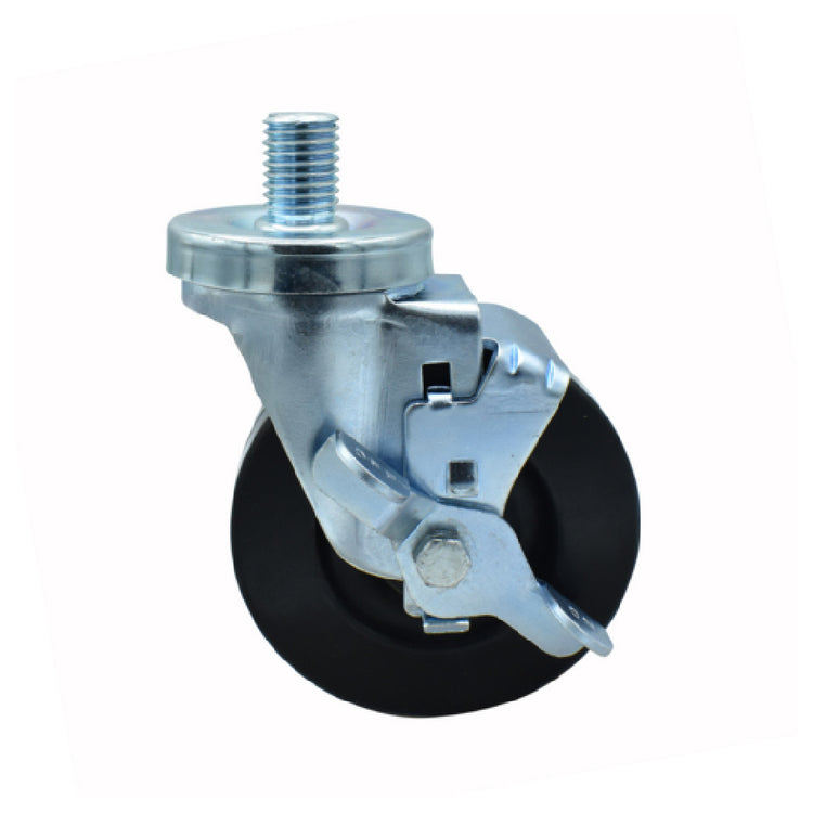 The BK Resources 4SBR-6ST-HR-TLB Hard Rubber Wheel is engineered with precision for a wide range of applications, offering a 4-inch diameter wheel paired with a 3/4"-10 x 1" threaded stem. This robust wheel is capable of supporting a weight capacity of up to 300 pounds, making it suitable for various demanding environments. It features a top lock brake system, ensuring stability and safety in operation. The wheel is designed to function efficiently across a broad operational temperature range from -40° to 160° F, making it versatile for both cold and hot environments. The inclusion of a nylon bearing sleeve and double ball bearings enhances its durability and smooth operation. Furthermore, the hard rubber material of the wheel provides a reliable option for different floor surfaces, while the zinc plating ensures its longevity and resistance to corrosion. This product is NSF certified, meeting stringent standards for health and safety. The BK Resources 4SBR-6ST-HR-TLB is an ideal solution for industries requiring durable and reliable mobility, such as manufacturing, warehousing, and food service, where equipment performance and reliability are paramount.