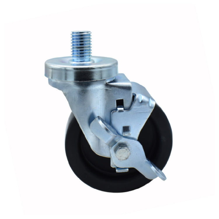 The BK Resources 4SBR-6ST-LDP-TLB Polyolefin Wheel is a premium choice for industrial and commercial applications requiring reliable mobility solutions. Featuring a 4-inch diameter, this wheel is designed to support a substantial weight capacity of up to 300 lbs, making it suitable for a variety of heavy-duty uses. It is equipped with a 3/4"-10 x 1" threaded stem, ensuring easy attachment and stability in various setups. The inclusion of a top lock brake enhances safety by allowing secure positioning when needed. Engineered to perform in a wide operational temperature range from -45°F to 180°F, this wheel is versatile and dependable under extreme conditions. The double ball bearing construction offers smooth and efficient movement, while the zinc-plated finish ensures durability and resistance to corrosion. Additionally, this wheel is NSF certified, highlighting its compliance with industry health and safety standards. The BK Resources 4SBR-6ST-LDP-TLB's robust technical specifications cater to sectors such as manufacturing, warehousing, and food service, where reliable and efficient mobility is paramount.