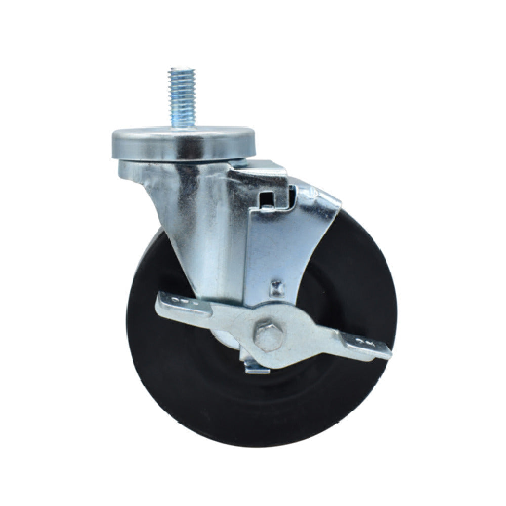 The BK Resources 5SBR-4ST-HR-TLB Hard Rubber Wheel is engineered for rigorous industrial environments, boasting a 5-inch diameter for robust support and maneuverability. Its 1/2"-13 x 1" threaded stem is designed for secure attachments, enhancing the wheel's stability in demanding operational conditions. This wheel is equipped with a top lock brake, allowing for reliable stationary positioning when necessary. With a formidable weight capacity of 300 lbs, it is capable of supporting heavy equipment efficiently. The operational temperature range of -40° to 160° F ensures performance under extreme conditions, making it suitable for varied industrial applications. The inclusion of a nylon bearing sleeve coupled with double ball bearings enhances its smooth operation and longevity. The wheel's zinc-plated finish ensures durability and resistance to corrosion, further extending its life span. Certified to NSF standards, this wheel meets stringent public health and safety guidelines, making it ideal for use in environments where hygiene is paramount. The BK Resources 5SBR-4ST-HR-TLB Hard Rubber Wheel is a versatile and durable choice for industries requiring high-performance mobility solutions. Its carefully considered design and robust construction make it a valuable asset for manufacturing, warehousing, and food service operations.