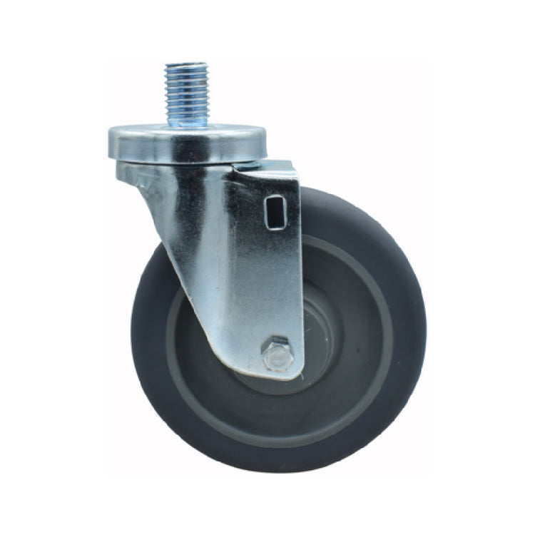 BK Resources 5SBR-6ST-GR Rubber Wheel is engineered for versatility and durability, featuring a 5-inch diameter and a 3/4"-10 x 1" threaded stem, suitable for a range of industrial applications. This wheel is designed without a brake, emphasizing its suitability for environments where continuous movement is required. Its non-marking rubber composition ensures it leaves no traces, making it ideal for delicate surfaces. With a robust weight capacity of 250 lbs, it provides reliable support for medium to heavy loads. The operational temperature range spans from -45°F to 180°F, highlighting its adaptability to extreme temperature conditions. Resistant to oil, grease, water, and most solvents, the wheel is suitable for harsh environments, promising longevity and reduced maintenance needs. The inclusion of double ball bearings enhances its smooth and quiet operation, a critical feature in noise-sensitive settings. Zinc plating adds an extra layer of corrosion resistance, extending the wheel's lifespan. Its gray color and NSF certification further underscore its compliance with industry standards, making it a dependable choice for sectors ranging from logistics to manufacturing, where consistent performance and adherence to safety regulations are paramount. This wheel is a practical solution for businesses seeking reliability and quality in their equipment components.