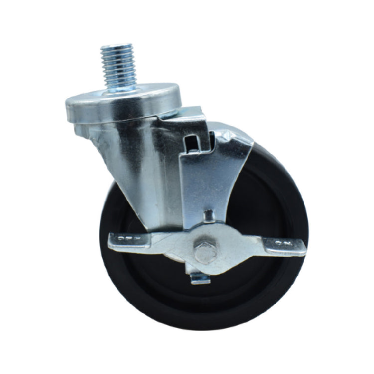The BK Resources 5SBR-6ST-LDP-TLB Polyolefin Wheel stands out as a durable and versatile component in various industrial applications. Featuring a 5-inch diameter, this wheel is engineered with a 3/4"-10 x 1" threaded stem, ensuring a secure fit in compatible equipment. Its standout attribute is the top lock brake, providing reliable stability and control, especially crucial in dynamic environments. With a substantial weight capacity of 300 pounds, this wheel is robust enough for heavy-duty usage. The operational temperature range is notably broad, from -45°F to 180°F, which underscores its adaptability in diverse conditions, from cold storage facilities to heated environments. The wheel is equipped with a double ball bearing design, enhancing its performance by ensuring smooth and efficient mobility. Additionally, the zinc-plated finish offers resistance to corrosion, extending the product's longevity. Certified by NSF, this wheel meets stringent health and safety standards, making it suitable for use in sensitive settings such as food service or medical facilities. The BK Resources 5SBR-6ST-LDP-TLB Polyolefin Wheel is an invaluable asset across different market segments, offering a blend of strength, reliability, and compliance with industry standards.