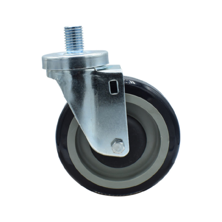 The BK Resources 5SBR-6ST-PLY Polyurethane Wheel 5" Diameter 3/4"-10 X 1" Threaded Stem is a high-performance component designed for versatile industrial applications. With a diameter of 5 inches, this wheel supports a substantial weight capacity of 300 pounds, ensuring reliability and efficiency in demanding environments. The 3/4"-10 x 1" threaded stem enhances stability and ease of installation across various equipment. Notably, this wheel operates effectively within a wide temperature range from -45°F to 180°F, making it suitable for diverse climatic conditions. The absence of a brake allows for smooth, unhindered movement, while the double ball bearing construction ensures durability and quiet operation. Furthermore, its zinc-plated finish provides an additional layer of corrosion resistance, complemented by its NSF certification, which guarantees adherence to public health standards. The polyurethane material is particularly resistant to acids and caustics, offering a robust solution for chemical-intensive environments. Ideal for industries requiring high durability and resistance to harsh conditions, such as manufacturing, warehousing, or food processing, the BK Resources 5SBR-6ST-PLY wheel combines advanced material technology with precise engineering to deliver a dependable and versatile solution for a wide range of operational needs.