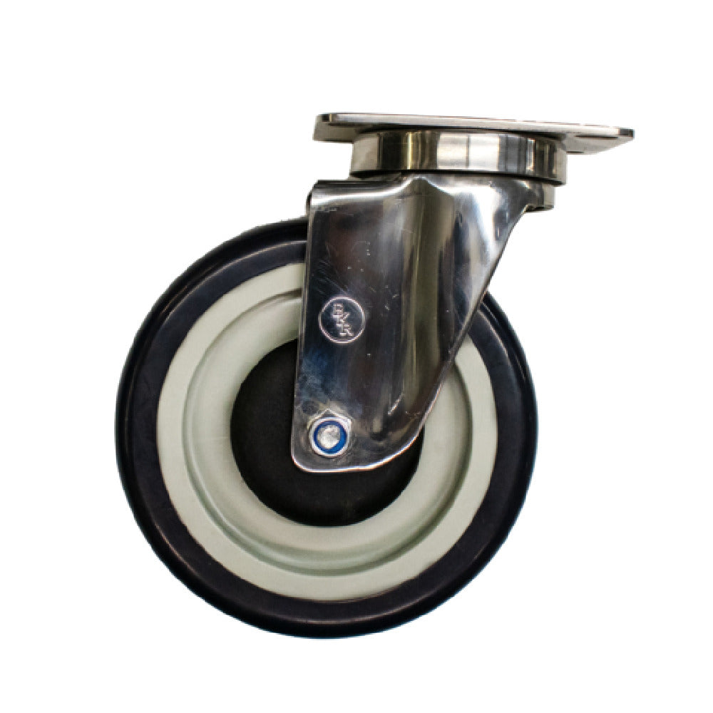 The BK Resources 5SS-1PT-PLY Caster 5" Diameter Swivel Plate Non-marking Polyurethane Tread is a high-performance component designed for versatility and durability in various industry settings. Featuring a 5-inch diameter swivel plate, this caster ensures smooth and agile movement while the non-marking polyurethane tread preserves floor surfaces, making it ideal for environments that require both mobility and care. Engineered to support up to 300 pounds, it is suitable for heavy-duty applications. The 2-3/8" x 3-5/8" top plate and 1/2" king pin ensure robust attachment, while the double ball bearing system enhances load stability and maneuverability. Resistant to acids and caustics, this caster is well-suited for industrial environments where exposure to such substances is common. Its operational temperature range from -45° to 180° F allows it to perform consistently in extreme conditions. The stainless steel rig provides durability and resistance to corrosion, ensuring long-term reliability. Additionally, NSF certification signifies adherence to public health and safety standards, making it a trusted choice across various sectors. This caster is particularly valuable for industries requiring reliable, non-marking, and durable mobility solutions without compromising on structural integrity.