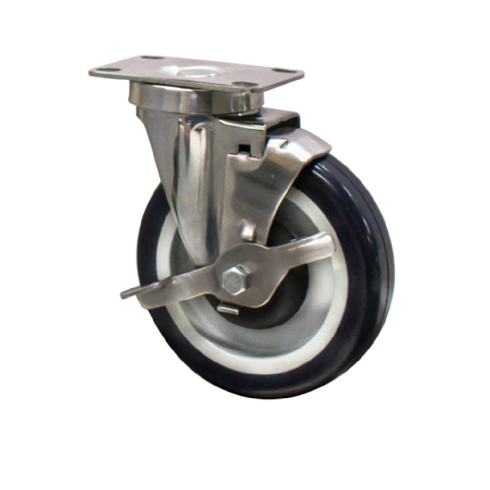 The BK Resources 5SS-1PT-PLY-TLB Caster 5" Diameter Swivel Plate Non-marking Polyurethane Tread is a highly durable and versatile component designed to meet various industrial needs. With a 5-inch diameter, this caster is equipped with a swivel plate that facilitates smooth and efficient movement, making it ideal for environments that require frequent repositioning. The non-marking polyurethane tread ensures that surfaces remain unblemished, a crucial feature for maintaining aesthetics in sensitive areas. This caster boasts a substantial 300 lb. capacity, accommodating heavy loads with ease. Its toe lock brake offers added stability by securely holding the caster in place when needed. Built to withstand harsh conditions, it is resistant to acids and caustics, enhancing its longevity in challenging environments. The top plate measures 2-3/8" x 3-5/8", and the 1/2" king pin and double ball bearing construction ensure robust performance. Suitable for a wide operational temperature range from -45° to 180° F, this caster is crafted with a stainless steel rig, providing strength and corrosion resistance. NSF certification underscores its adherence to safety and quality standards, making this caster a reliable choice for sectors ranging from food service to industrial applications.