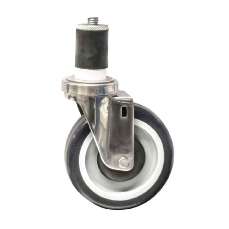 The BK Resources 5SS-RA-PLY Caster - a 1-1/2" expanding stem with a 5" polyurethane wheel - is engineered to support a weight capacity of 300 lb., making it a reliable choice for heavy-duty applications. This caster is distinguished by its resistance to acids and caustics, ensuring durability and longevity in challenging industrial environments. It is operational within a wide temperature range of -45° to 180° F, which enhances its versatility across various settings, from cold storage facilities to high-temperature manufacturing areas. The NSF certification further underscores its compliance with health and safety standards, assuring users of its quality and safety in food-related applications. This caster’s unique value proposition lies in its ability to adapt to different segment markets, particularly those requiring robust mobility solutions without compromising on chemical resistance or operational temperature flexibility. Its design makes it suitable for industries such as food service, manufacturing, and warehousing, where both resilience and adaptability are crucial. The expanding stem facilitates secure attachment to a variety of equipment and fixtures, enhancing its practicality and ease of use. Whether for replacing existing casters or outfitting new equipment, the BK Resources 5SS-RA-PLY Caster delivers dependable performance tailored to meet industry-specific demands.