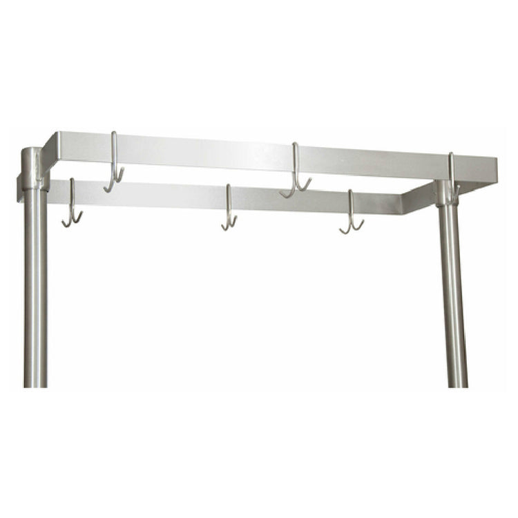 The BK Resources APQ-72 Pot Rack Table Mount 72"W x 50"H is a versatile and durable solution for efficient kitchen organization. This pot rack is designed with a 360-degree configuration, allowing for comprehensive access and storage flexibility. It features an adjustable system that extends 8 inches from the uprights on both sides, providing ample room for pots and pans. Constructed from high-quality stainless steel, the APQ-72 ensures long-lasting durability and resistance to corrosion, making it suitable for demanding kitchen environments. The inclusion of 24 stainless steel double-prong pot hooks facilitates secure hanging and easy retrieval of cookware, optimizing space and workflow efficiency. Additionally, self-tapping screws are provided to ensure a straightforward installation process. This pot rack is particularly valuable across various market segments within the culinary industry, including commercial kitchens, catering services, and food preparation facilities, where maximizing space and maintaining order are paramount. The BK Resources APQ-72 Pot Rack Table Mount not only enhances kitchen functionality but also reflects a commitment to quality and practicality, making it a strategic addition to any professional cooking space. Its thoughtfully engineered design meets the high standards of professional chefs and kitchen operators seeking reliable and efficient storage solutions.