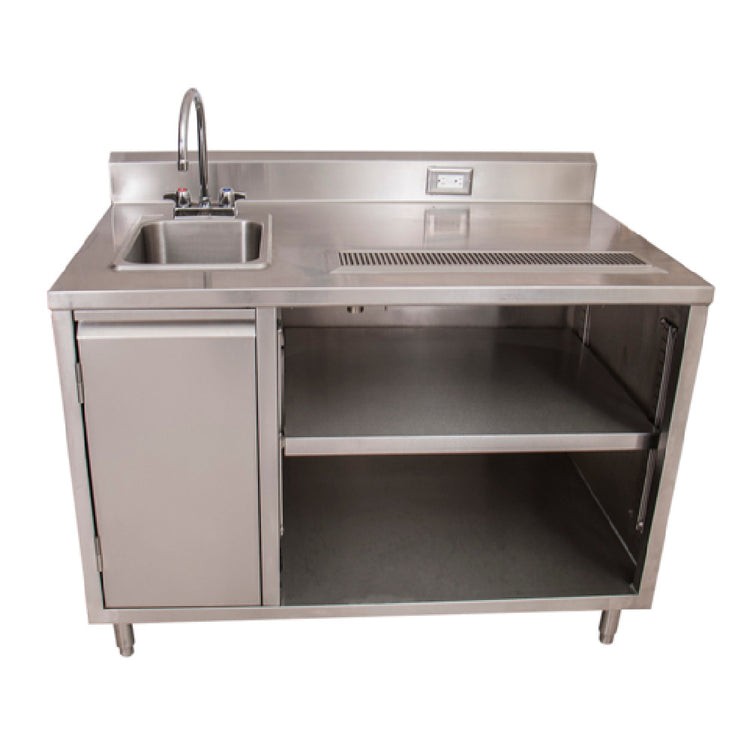 The BK Resources BEVT-3048L Beverage Table - 48"W x 30"D - is a robust solution designed for efficient beverage service environments. It features a 14" x 10" sink positioned on the left, complemented by the BKF-4DM-3G-G gooseneck faucet, enhancing its versatility for various tasks. Constructed with a 14-gauge stainless steel top and an 18-gauge stainless steel body, this table ensures durability and longevity in demanding settings. Its built-in 18" urn trough with drain facilitates easy disposal of liquids, optimizing workflow efficiency. The table includes a hinged door beneath the sink, providing convenient storage space alongside an adjustable shelf to accommodate diverse needs. A 5" riser backsplash integrates a standard electric outlet, offering additional utility. Supported by sturdy stainless steel legs, this beverage table is NSF certified, reflecting its adherence to high industry standards. With a lead time of 3-10 days, the BK Resources BEVT-3048L Beverage Table is a reliable choice for restaurants, cafes, and catering services seeking a blend of functionality and quality in their beverage service setups.