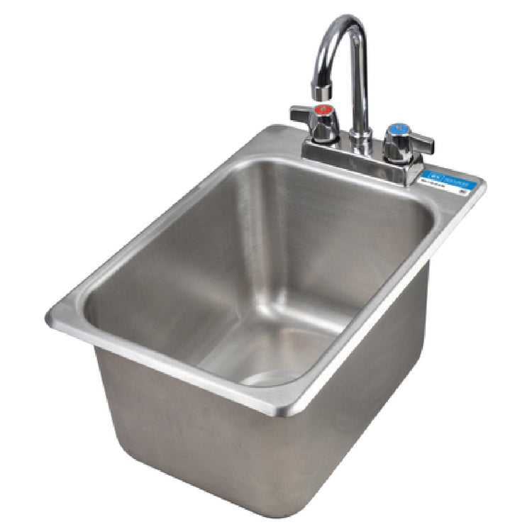 The BK Resources BK-DIS-1014-10-P-G Drop-In Sink One Compartment 12-1/8"W x 18-1/2"D x 9-3/8"H Overall Size is a meticulously designed sink ideal for various professional settings. Featuring a single compartment measuring 10" wide x 14" front-to-back x 9" deep, it is crafted to meet the versatile needs of commercial kitchens, laboratories, and healthcare facilities. Its construction from 18/304 stainless steel ensures long-lasting durability and resistance to corrosion, making it an essential component for environments demanding high standards of hygiene. The sink comes equipped with a deck mount faucet (BKD-5G-G) and a basket drain (BKDR-4), which complement its functionality and efficiency. A lead-free faucet emphasizes its compliance with safety standards, ensuring it's a sustainable choice. The installation requires an 11-1/2" x 17-7/8" cutout, facilitating easy integration into existing spaces. NSF certification further underscores its adherence to public health and safety standards, making it a reliable option across different industry segments. Whether utilized in hospitality, healthcare, or any other sector requiring robust and reliable sink solutions, this drop-in sink stands out for its practical dimensions and quality construction.