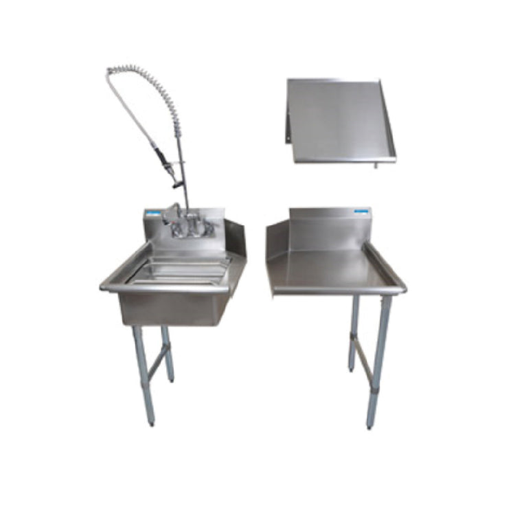 The BK Resources BKDTK-72-L-G Dish Table Kit is an expertly engineered solution designed for efficient left-to-right dishwashing operations. This comprehensive kit includes a clean dishtable (BKCDT-72-R) and a soiled dishtable (BKSDT-72-L), each measuring 72 inches, providing ample workspace for organized cleaning and sorting of dishes. A notable feature is the slant rack shelf (BK-SSH-63), which optimizes space utilization and facilitates easy drainage, ensuring that dishes dry efficiently. The inclusion of a pre-rinse basket (BK-PRB-5) aids in preliminary cleaning, reducing manual labor and enhancing workflow productivity. Furthermore, the pre-rinse assembly with an add-on faucet (BKF-SMPR-WB-AF8-G) is a sophisticated addition, delivering precision and ease of use for pre-rinsing operations. Certified by the NSF, this dish table kit meets stringent health and safety standards, making it suitable for a variety of commercial kitchen environments. The BK Resources BKDTK-72-L-G Dish Table Kit is specifically tailored for food service establishments requiring reliable and efficient dishwashing systems, delivered through its robust construction and thoughtful design elements that cater to both high-volume and smaller-scale operations within the industry.